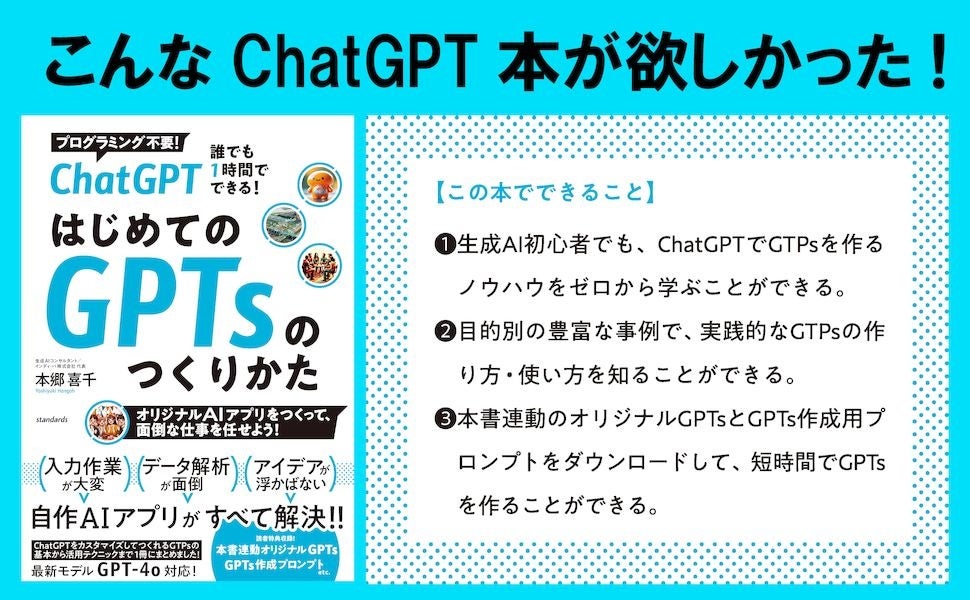 スタンダーズ株式会社は、ChatGPTをカスタマイズしてつくれるAIアシスタント「GPTs」の開発ノウハウをビギナー向けに解説する新刊書籍『ChatGPT 誰でも1時間でできる! はじめてのGPTsのつくりかた』(本郷喜千・著)を8月22日(木)に発売します。