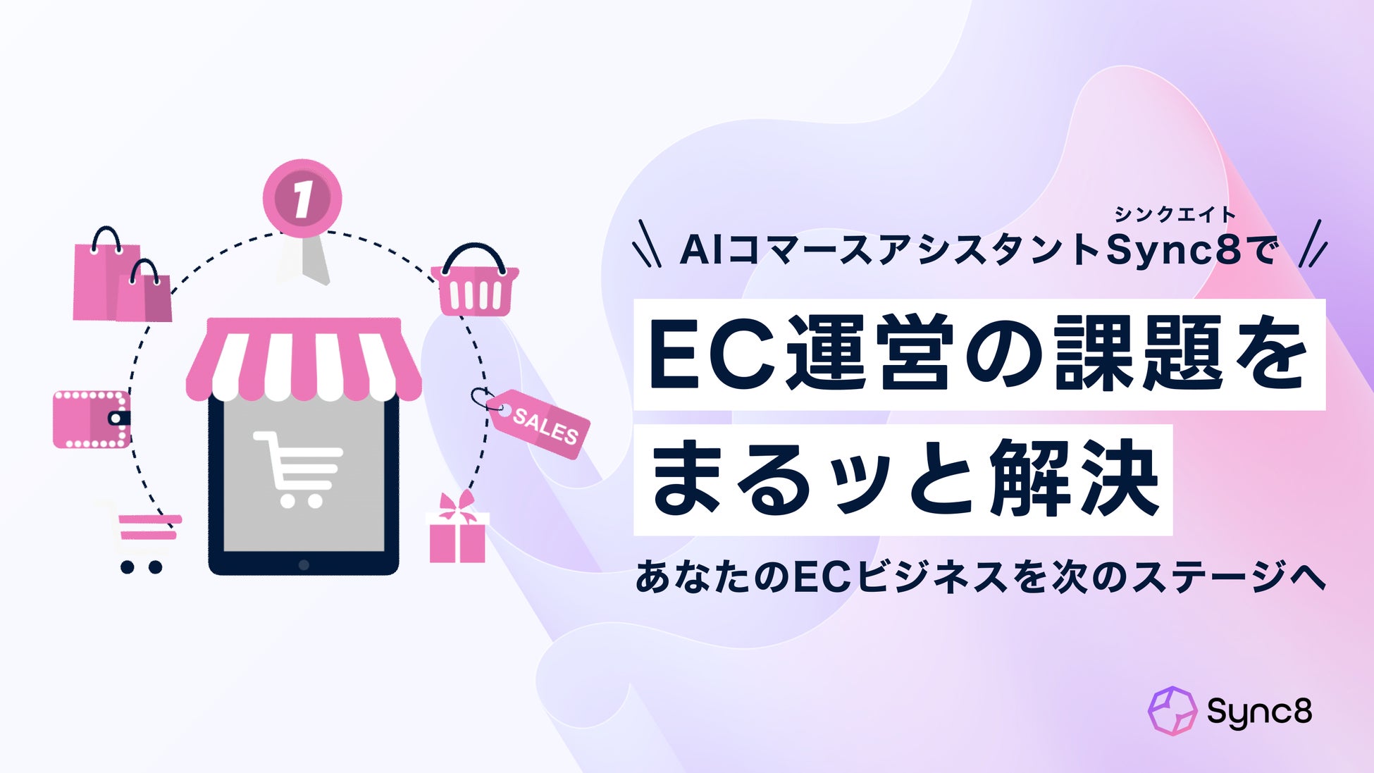 Sync8は、AIを活用した「EC運営最適化サービス」です。16年の現場経験を元に、「運営の流れ」「使っているツール群」「社内外にあるノウハウと情報」などを一度に見直し、連携・改善・有効活用することで、ビジネス全体が効率よくなるように最適化。AI技術による自動化と運営の定型化で、業務効率を向上させます。