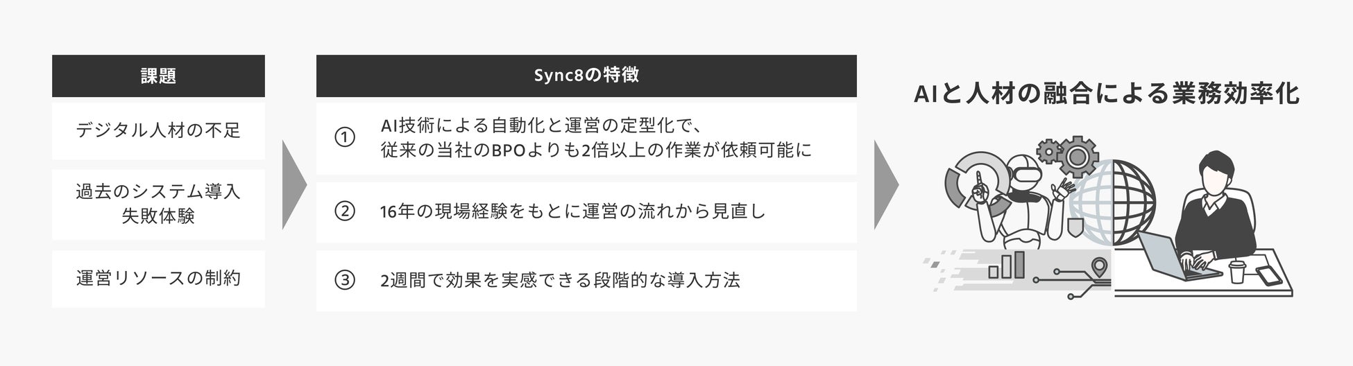 単なる業務代行ではなく、人による経験則の暗黙知と、ECに特化した生成AIツールが組み合わさることで、より的確かつ迅速な意思決定をサポートします。一般的な業務請負やAIツール提供が分散しがちですが、Sync8では両者が一体となり、スムーズな運営改善を実現します。
