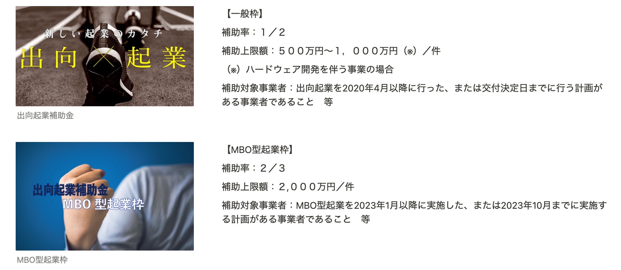 「出向起業補助金(MBO型起業枠)」では、大企業等が新規事業創造を目的として設立した子会社・ジョイントベンチャー・関連会社等が、経営者や従業員による買収等を通じて、資本独立したスタートアップとして、新規事業創造に向けた実務を加速・拡大させる取り組み(=「MBO型起業」) ※令和4年度事業より新設枠