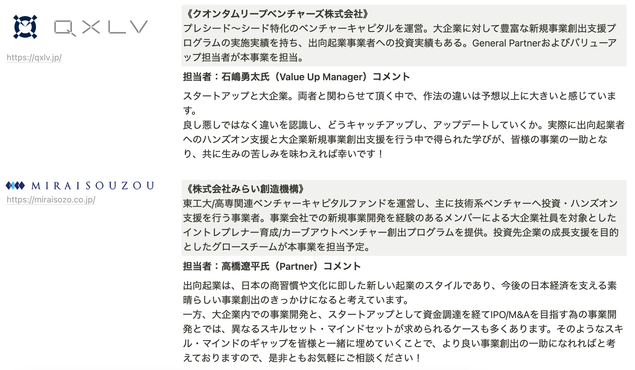 2社から派遣される新規事業開発のノウハウを有する専門家が、出向起業・MBO型起業を検討中の方との事業内容の壁打ちや、採択事業者からの個別相談対応・メンタリング、に対応することで、出向起業・MBO型起業の事例創出・事業拡大および外部資金調達を加速させます。
