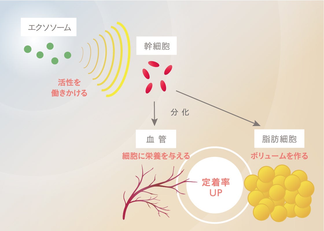 脂肪の定着・再生率を上げるためには、バストの血流を増やし、脂肪が生き残りやすい環境を整えなけれななりません。エクソソームは、こうした環境づくりの起点となる物質です。エクソソームが脂肪中の幹細胞に働きかけることで幹細胞の分化が活発になり、その結果、脂肪が生き残るために必要な血管の新生と、脂肪細胞への分化が促進されます。
