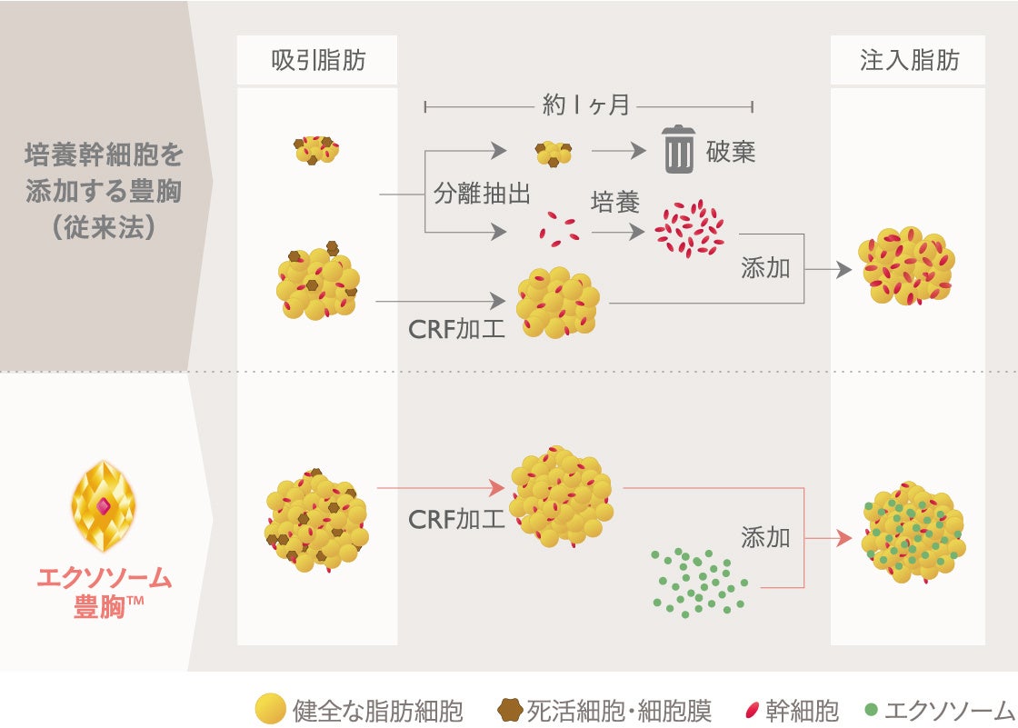太ももやお腹などの皮下脂肪を採取し、コンデンスリッチファット加工した後にエクソソームを添加。これをバストの皮下に注入する豊胸手術。