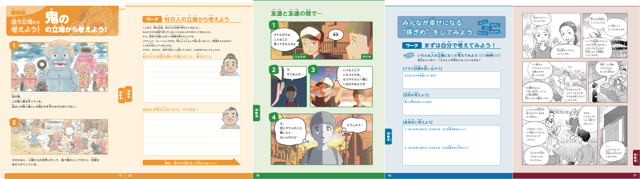 第4章は「自分もできる行動を行ってみよう」です。この章では、インドネシアの10歳と12歳の姉妹が、地域の自然を保護する目的で「バイバイ・レジ袋運動」をしたという、実際にあったお話を題材にしています。「小学生だからできない、してはいけない」という思い込みをせず、小学生でも、パブリック・リレーションズを実践すれば、世の中をより良くしていくことができる、ということを学べる章です。