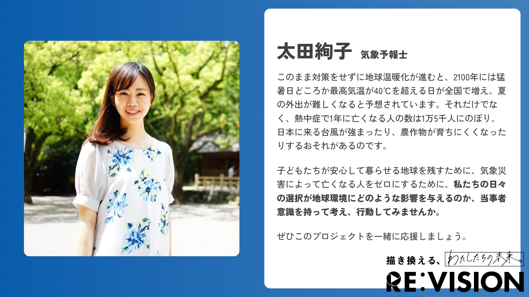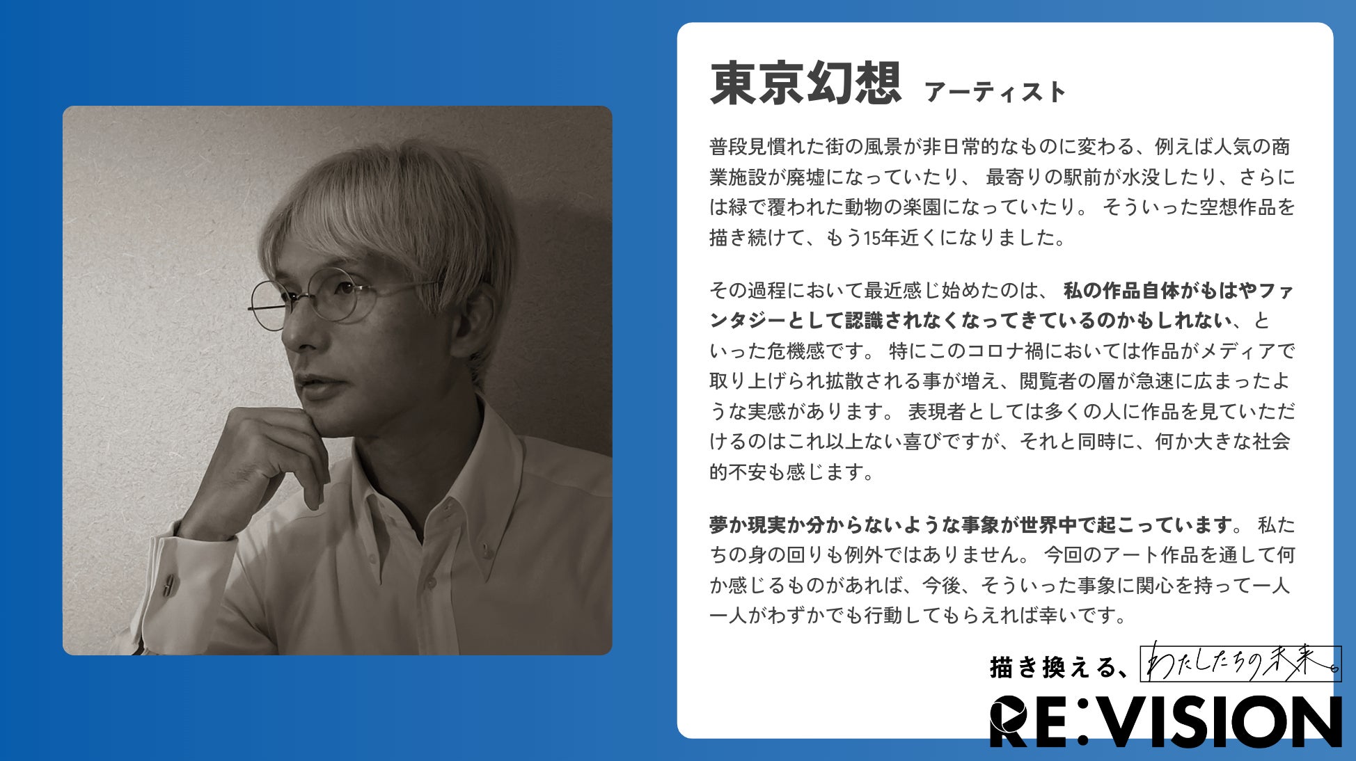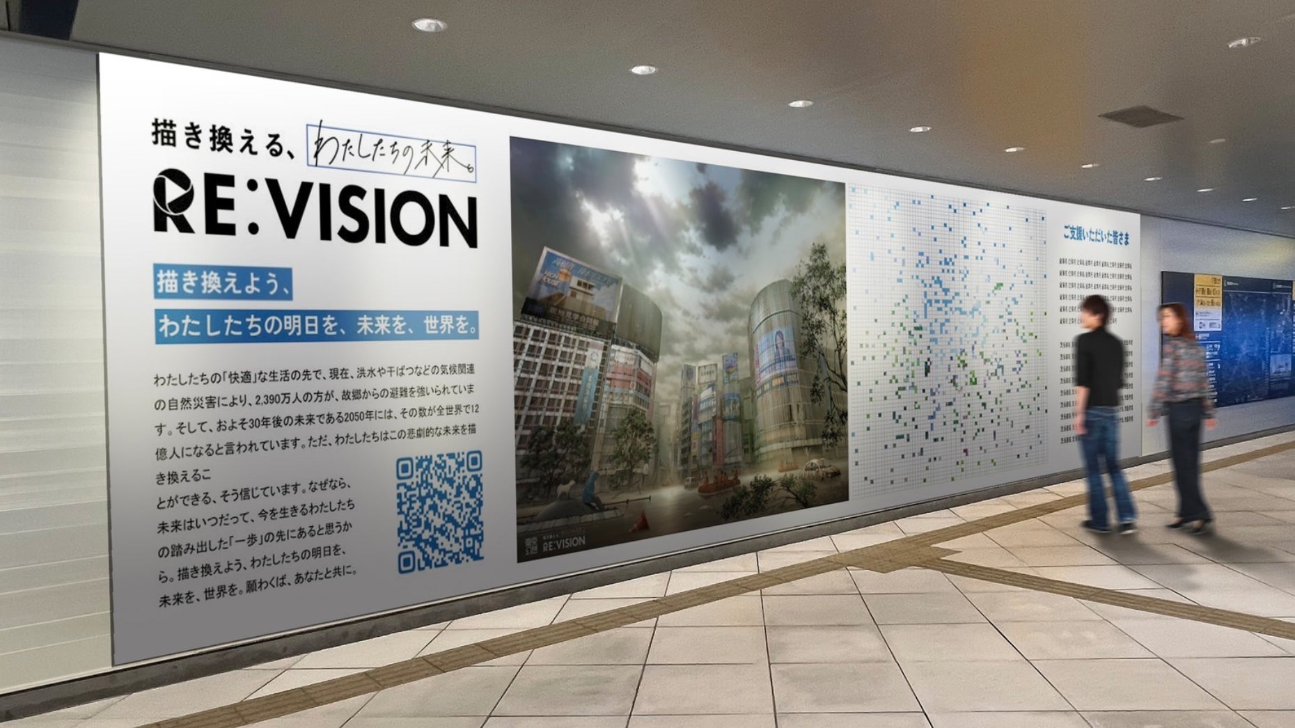 この未来を描き換えることができるのは、他でもなく「今を生きる、わたしたち」であり、RE:VISION ART PROJECT とは、より多くの皆様とともに、この未来を描き換えるための挑戦です。この作品が、気候変動や難民問題、そして私たちが暮らす日本の、世界の未来について考え、行動を起こすきっかけになればと考えております。