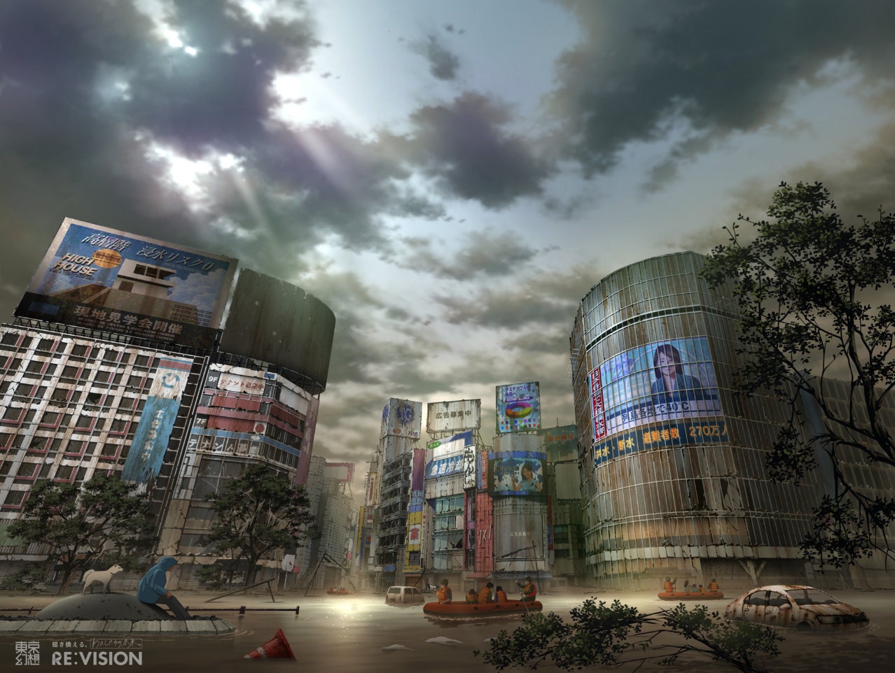 激しい豪雨により洪水が起きた、渋谷駅前のスクランブル交差点。洪水の被害から逃げ遅れた人々を救出に向かう複数のボート。大型ビジョンには洪水被害と「列島各地で40℃」を伝える見出し。