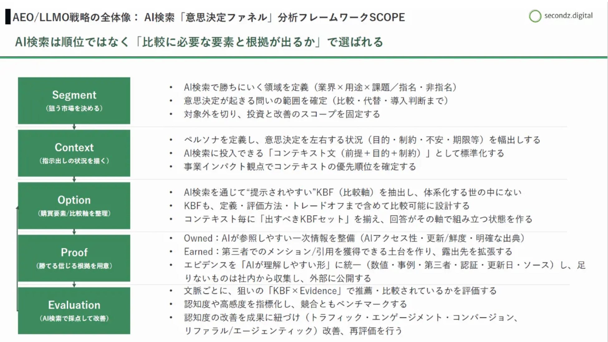 そのため企業は、ターゲットを単一の像で捉えるのではなく、「細分化されたペルソナ」に、自社の強みが「どういったコンテキスト」で刺さるのかを再定義し、自社の強みをAIが理解できる「エビデンス」として継続的、かつ多面的に発信していく必要があります。かつ、AIが理解できる「エビデンス」のための情報を収集し、「エビデンス」を作り、発信することはマーケティング部署だけに閉じる話ではなく、R&Dや製造、営業、PR/IRなど会社全体の協力が必要です。つまりAI検索対策とは、事業戦略そのものを見直す取り組みだと言えるでしょう。