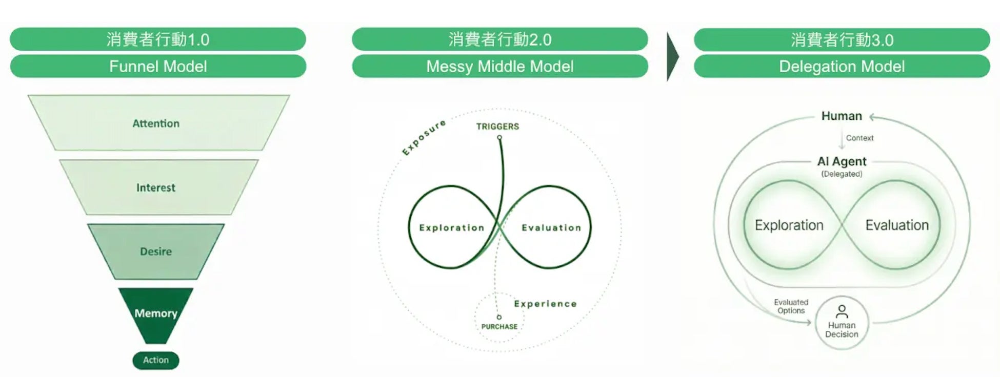これにともない、生活者の購買行動モデルも激変するでしょう。これまで主流だった「自力で探索し、比較・検討を繰り返す」というモデルは、人間にとって非常に認知コストが高い行動でした。そこで当社が提唱するのが、「Delegation Model(委譲モデル)」です。