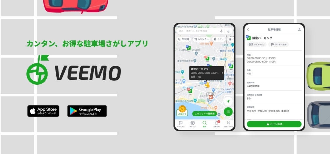 VEEMOは現在地や目的地周辺の駐車場を、希望の条件に合わせてカンタン、便利に見つけられる駐車場さがしアプリです。