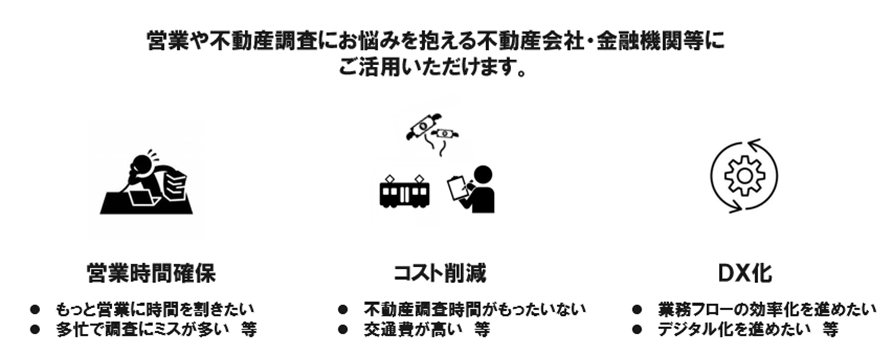 不動産調査業務は、営業担当者が不動産の現地調査から契約書の作成等の実務まで担っているケースが多く、「本来時間を割くべき営業活動に集中できない」といった課題を抱えている法人や従業員が多く存在しております。また、不動産調査のオンライン化は未だ進んでおらず、実際に現地や役所に足を運ぶケースが殆どで、多くの時間とそれに伴う人件費が費やされてきました。
