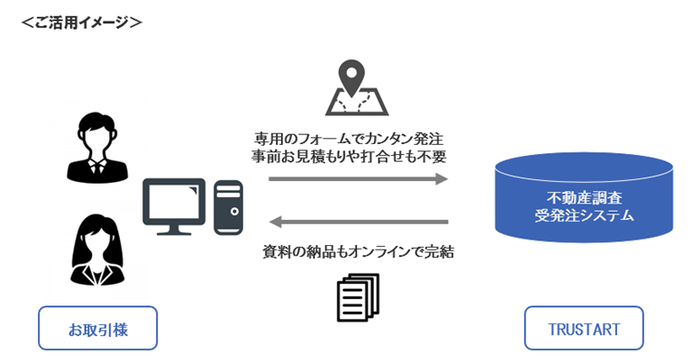 煩わしい不動産調査の発注・納品はすべてオンライン上で完結。事前のお見積もりや打ち合せも不要です。調査資料の納品も、専用システムによりオンラインで行うため、カンタンに利用できます。