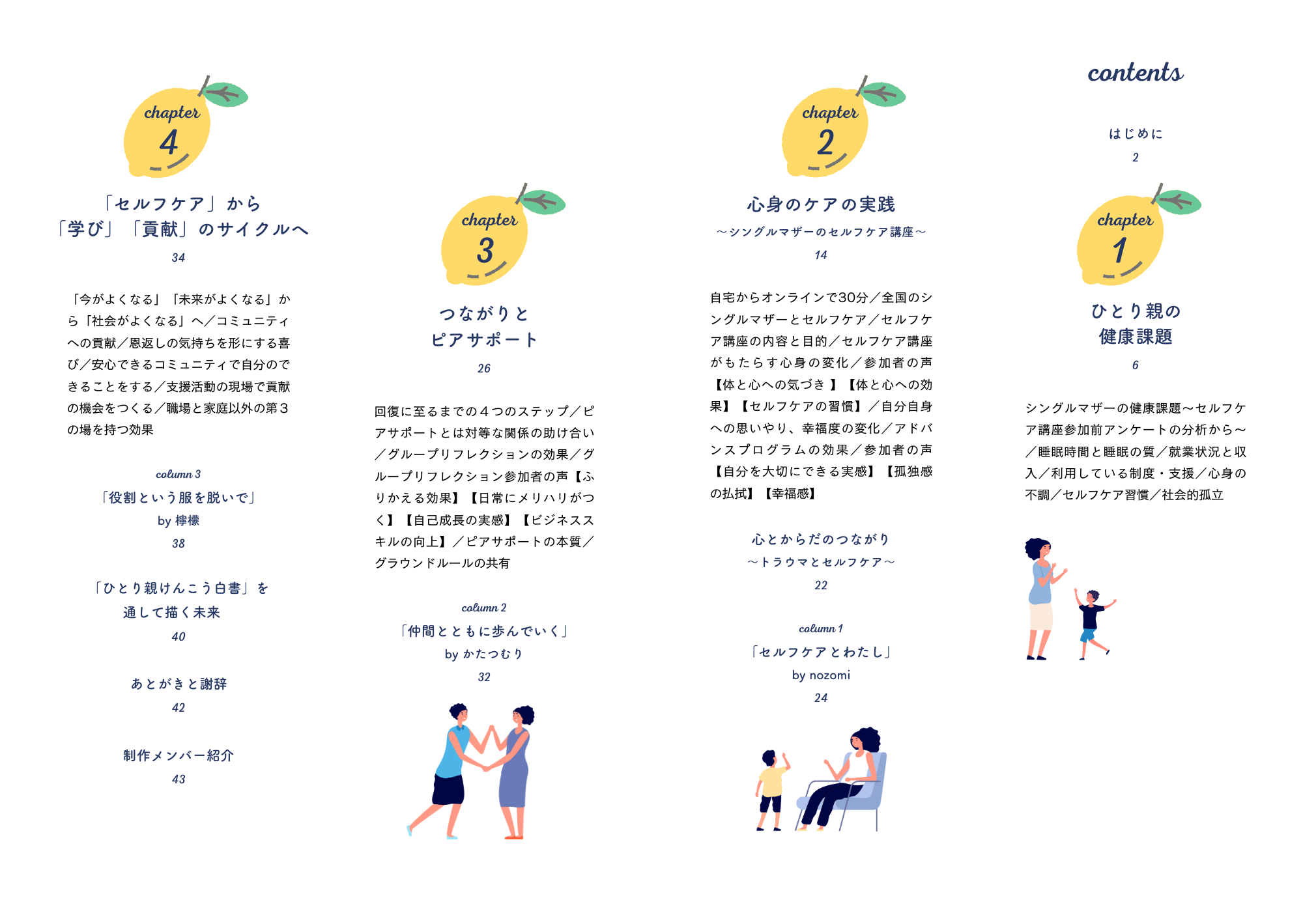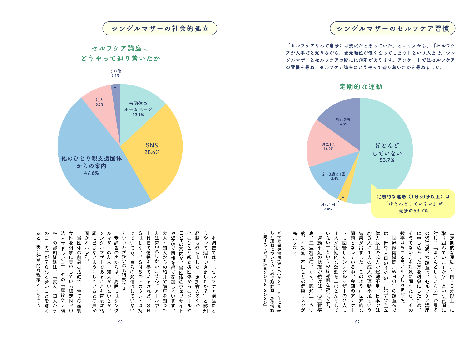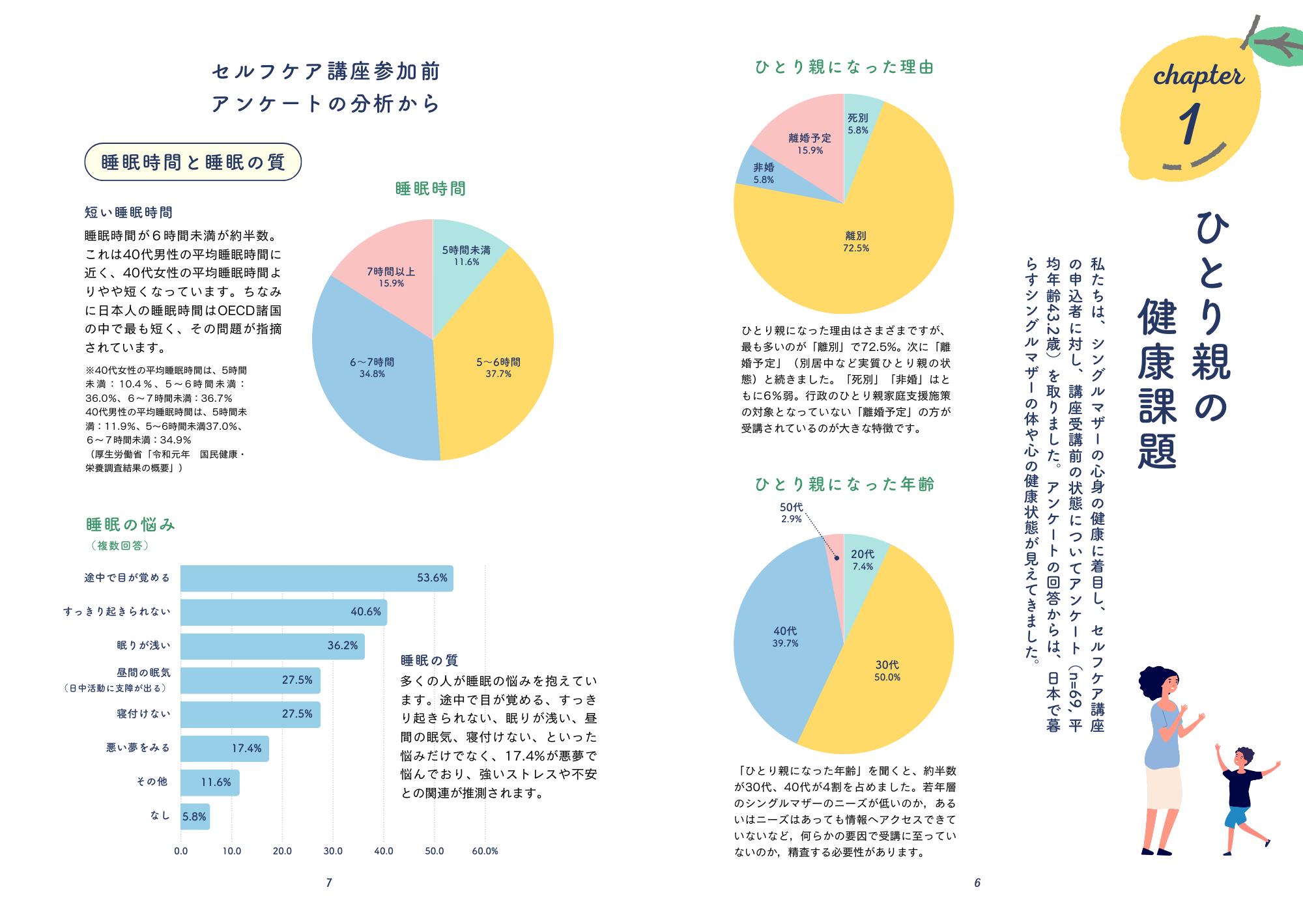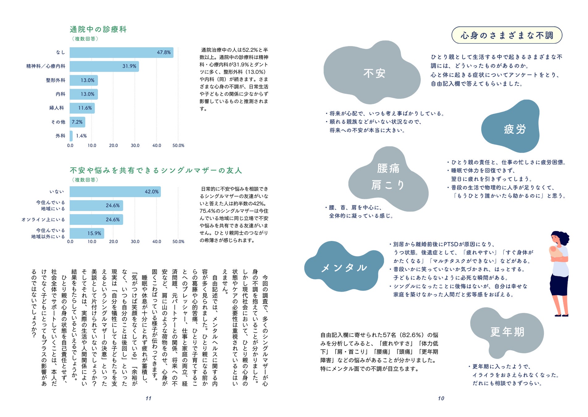 本調査の研究結果を「論文発表のみに留めず、広く社会に向けて発信したい!」との思いを持って、この度『ひとり親けんこう白書』という小冊子を制作いたしました。冊子はA5版44ページの読みやすいデザインで、より多くの市民に届くよう、工夫して執筆・編集いたしました。現役のシングルマザーはもちろん、全国の女性センター、都道府県の子育て支援課、シングルマザー支援団体など、支援に携わる皆さまのお手元に届くよう願っています。