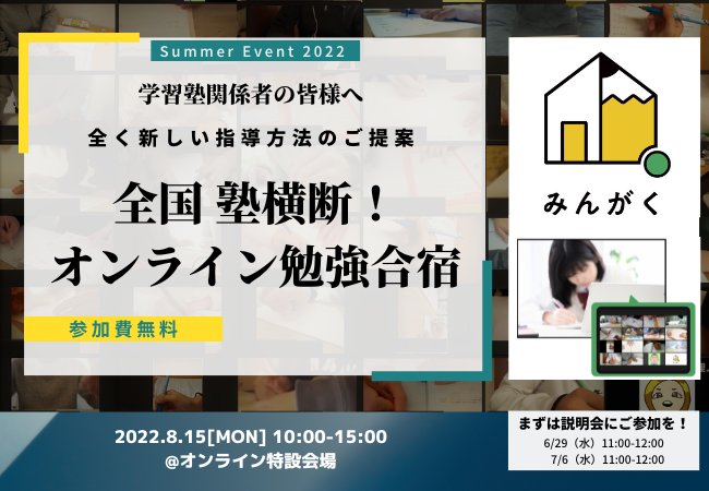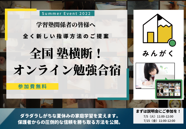 「全国・塾横断!無料オンライン勉強合宿」など、夏休み直前の今だから刺さる生徒募集ノウハウ公開を、みんがく(塾の垣根を越えた合同オンライン自習室)が決定