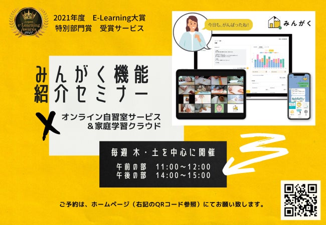 「みんがく」は、多くの塾が抱える「塾では勉強を頑張る生徒が、自宅に帰ると勉強しない」という悩みを解決するために立ち上がったプロジェクトです。全国の塾講師・塾経営者の協力による合同オンライン自習室から始まった業界初のサービスです。オンライン上にある学習室の開室時間(365日開室18時~22時30分 ※土日祝・長期休暇は午前中も)には、管理人が常駐します。学習室に入室した生徒は、全国で頑張る仲間からの刺激と、管理人からの激励メッセージによりモチベーションを高め、緊張感を維持できることにより、家庭での学習が習慣化されるというしくみになっています。各塾の先生は、その学習記録をいつでも確認でき、ブラックボックスになってしまいがちな生徒の家庭学習を可視化することができるようになっています。このような新しい仕組みが評価され、昨年2021年には、文部科学省や経済産業省が後援する「日本e-Learning大賞」での特別部門賞、さらにはAES(Asia EdTech Summit)では、アジア太平洋地域のEdTech分野で目覚ましい成果を上げた企業を表彰するGold賞を受賞しました。このように有識者からもクオリティが評価されるようになってきたことから、本年より本格的な全国展開を予定しております。