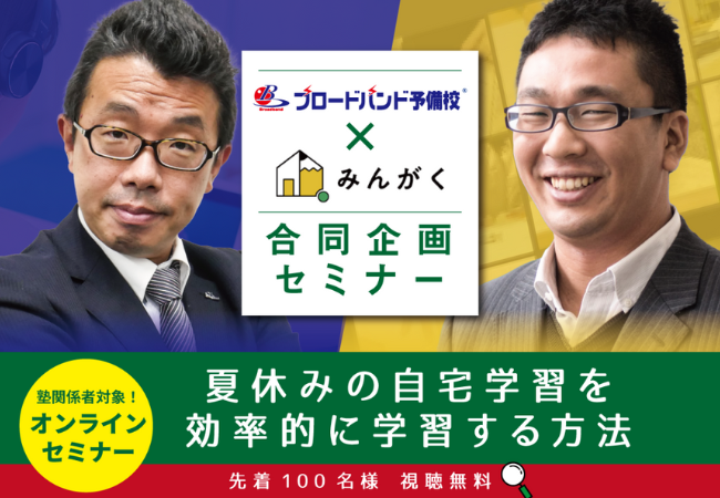 そこで、みんがくでは、大学受験のスペシャリストが集う「ブロードバンド予備校」と共催で、【家庭学習×高校生指導の新常識】をテーマに、「効果的な夏休みの自宅学習 その実践方法とは!?」という表題のセミナーを開催することを決定しました。