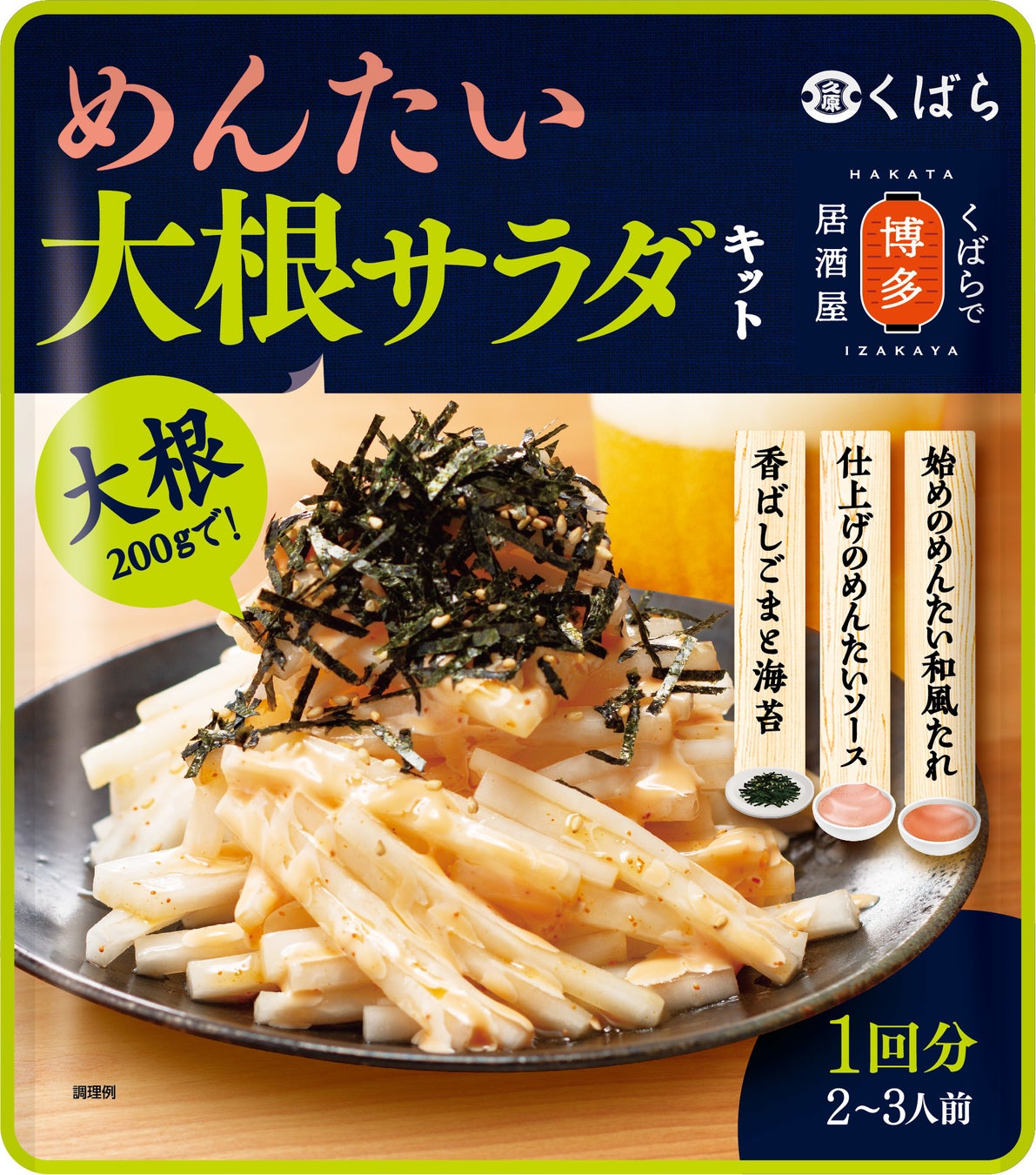 「くばらで博多居酒屋」シリーズから、大根サラダをめんたい味で楽しんで頂けるサラダキットが新登場しました。めんたい和風たれ、めんたいソース、トッピングがセットになった商品です。おつまみなど、夕食の1品として博多ならではの味わいをご家庭でお楽しみいただけます。