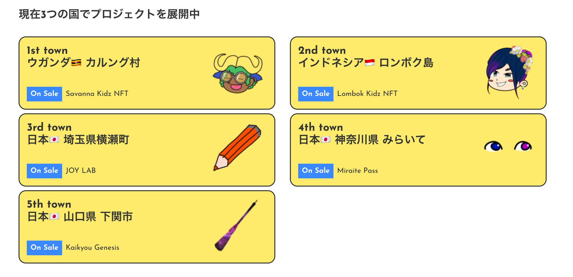 「Open Town」は、「Web3技術」と「社会貢献」を組み合わせて、世界各国で自律的なまちづくりを実施するために、資金と応援者を持続的に集めるクラウドファンディングサービスです。プロジェクトを実施する地域で暮らす住民、NGOや自治体、企業が主体となってプロジェクトを運営し、その地域独自のデジタルアート(NFT)を制作・販売し、その売上収益を使ったまちづくりの実施と、支援者(NFT購入者)へのリワードの提供を循環させる仕組みを構築しています。これまでに海外ではウガンダ共和国(カルング村)、インドネシア共和国(ロンボク島)、国内では埼玉県横瀬町でプロジェクトを実施しています。今後もさらに海外・国内でOpen Townを広げ、世界各国で自律的なまちづくりを行うチームのネットワークを構築していきます。