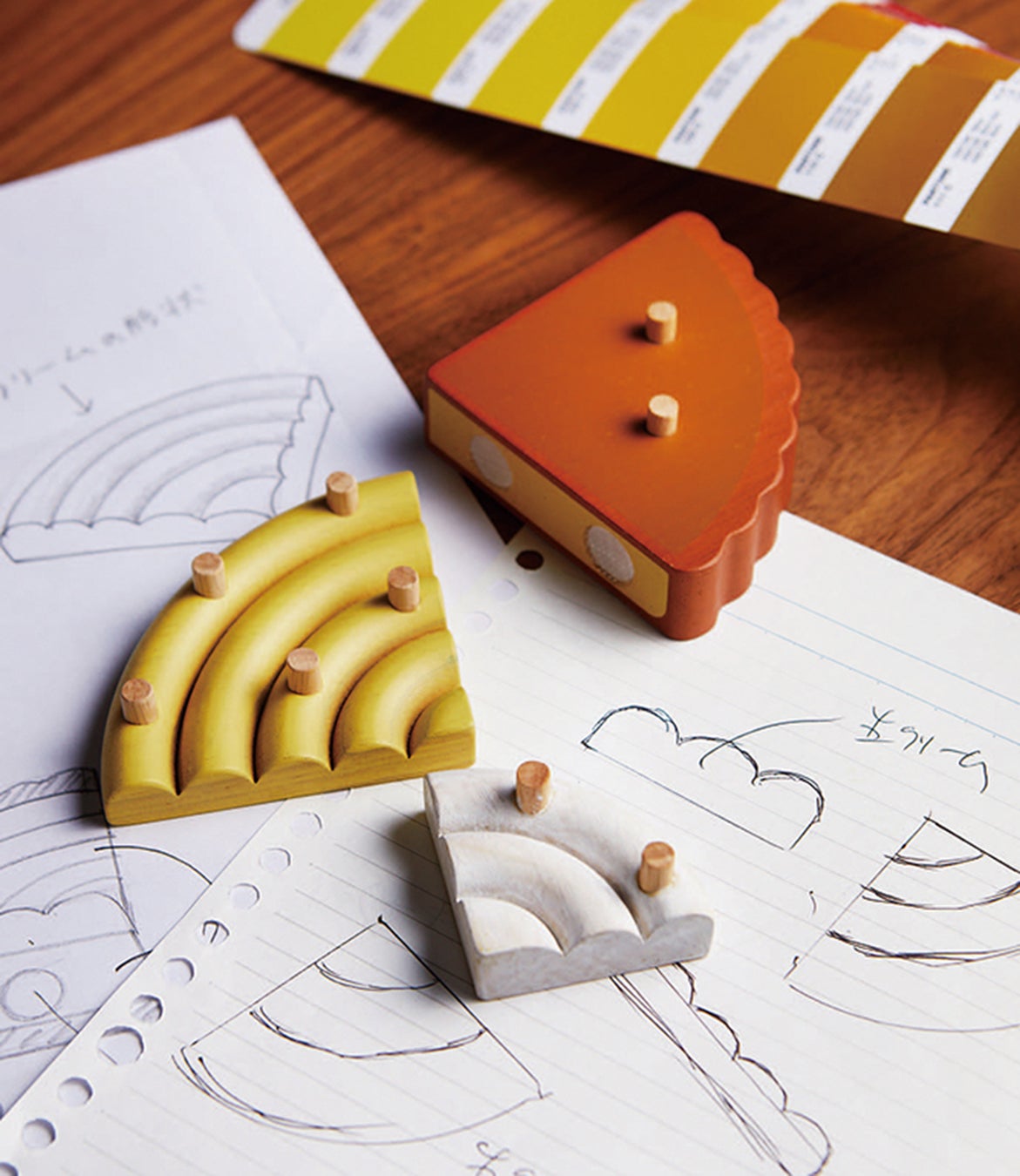 木製玩具ならではの温もりのある木の手触りや質感は、こどもだけでなく大人も夢中に!丁寧に磨かれ、美しい塗装が施されたパーツは、何度も試行錯誤を重ね、本物らしい美味しそうな色あいにたどり着きました。うっすら透けて見える木目も、フルーツの繊維やタルトの焼き色のように、より自然なものに見せてくれます。木製の上質な質感は何度も手にとって遊びたくなります。