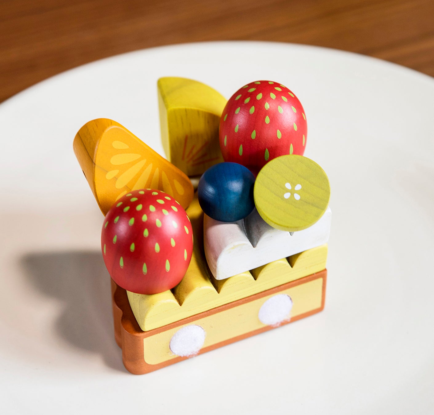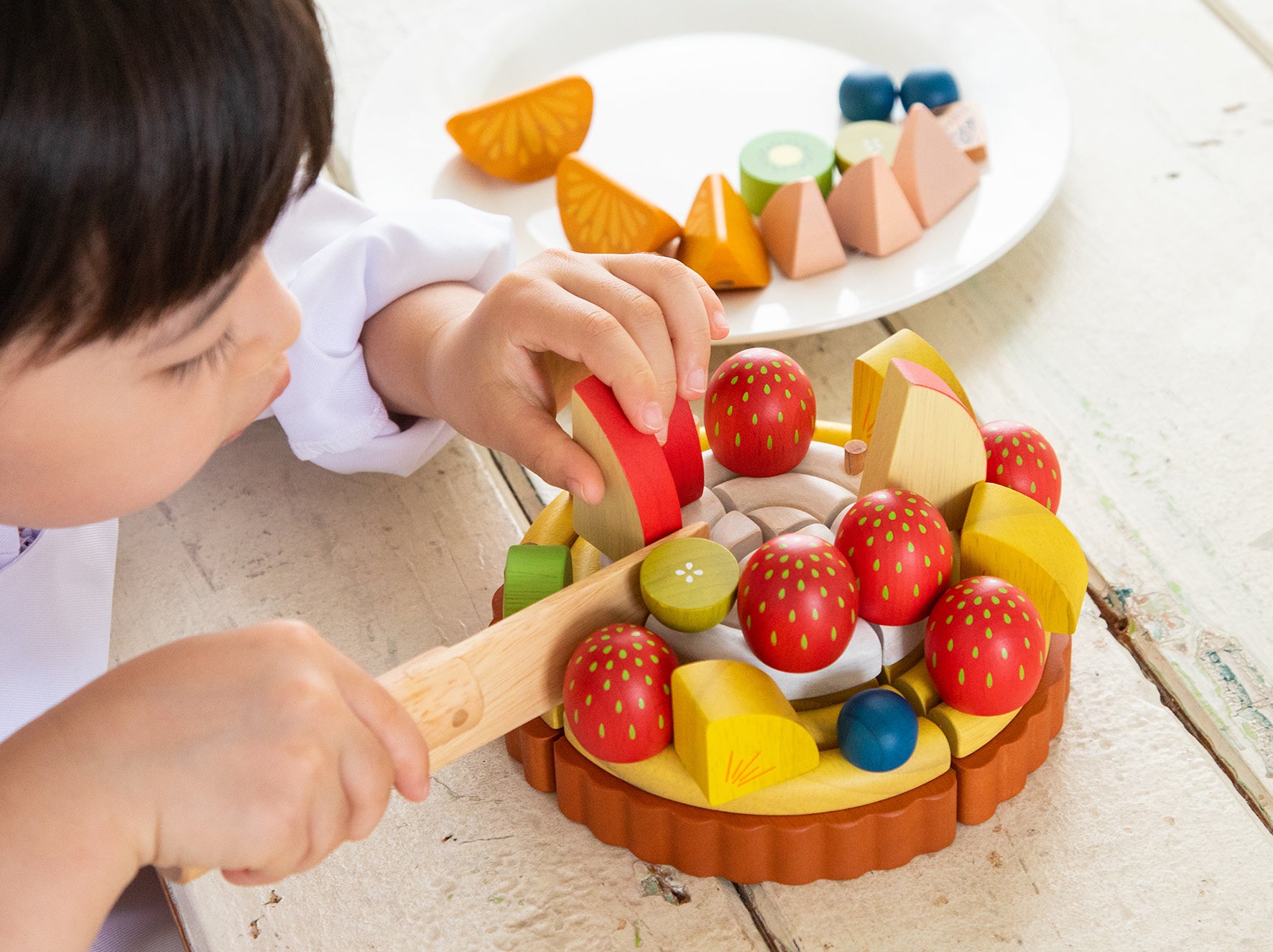 それぞれのフルーツの形や大きさ、色あいを見ながら「どこに何のフルーツを置こうかな」と試行錯誤しながら遊ぶことで、空間認識力・造形力・色彩感覚・指先の器用性を育みます。付属のナイフでザクっと4等分するおままごと遊びで、「はいどうぞ!」と思いやりの心やコミュニケーション力を育み、一般家庭のみならず、幼稚園・保育園などで遊ぶおもちゃとしてもご好評いただいております。