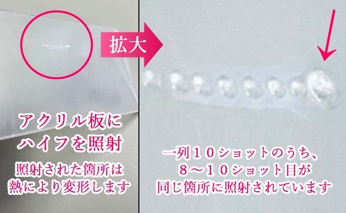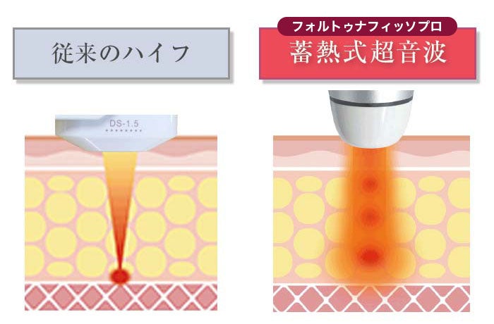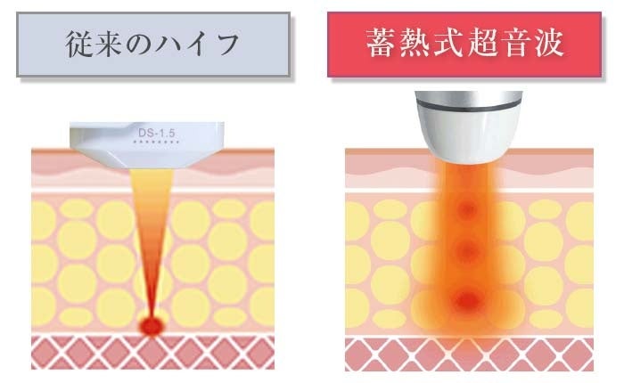 従来のハイフ(高密度焦点式超音波)は小さな点で熱を照射していましたが蓄熱式超音波は円柱状に照射するため、従来のハイフのように熱が1点に集中することがないので安全に照射できます。