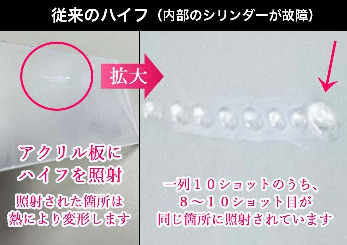これは内部のシリンダーが故障したハイフです。内部のシリンダーが故障し詰まると、同じ箇所に何度も照射してしまいます。これがやけどなどの被害に繋がってきました。耐久性テストの甘い機械はこのような危険性が非常に高いということを、エステサロンに認識していただきたい問題です。