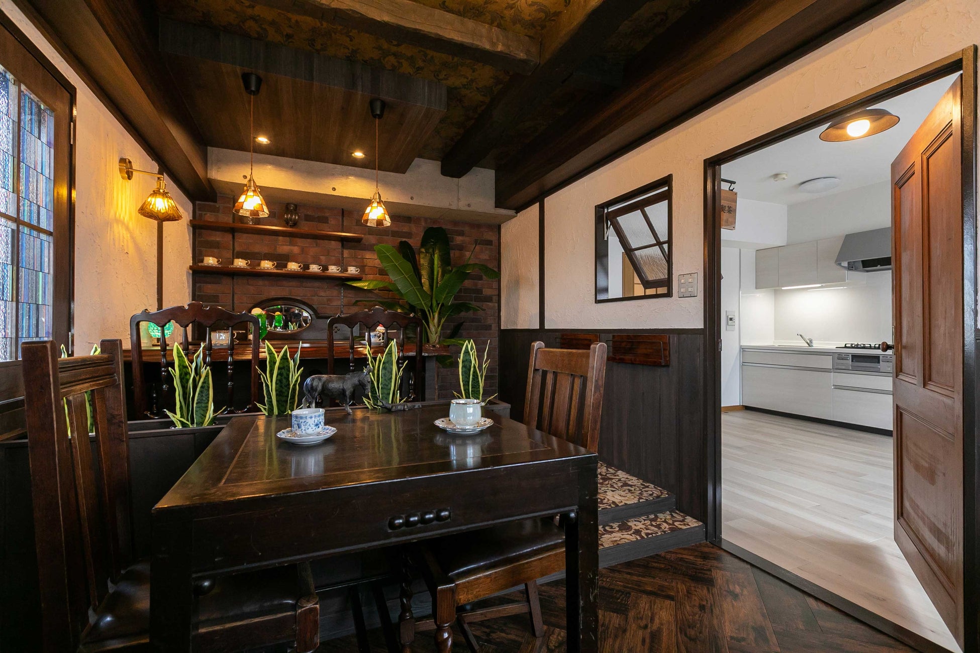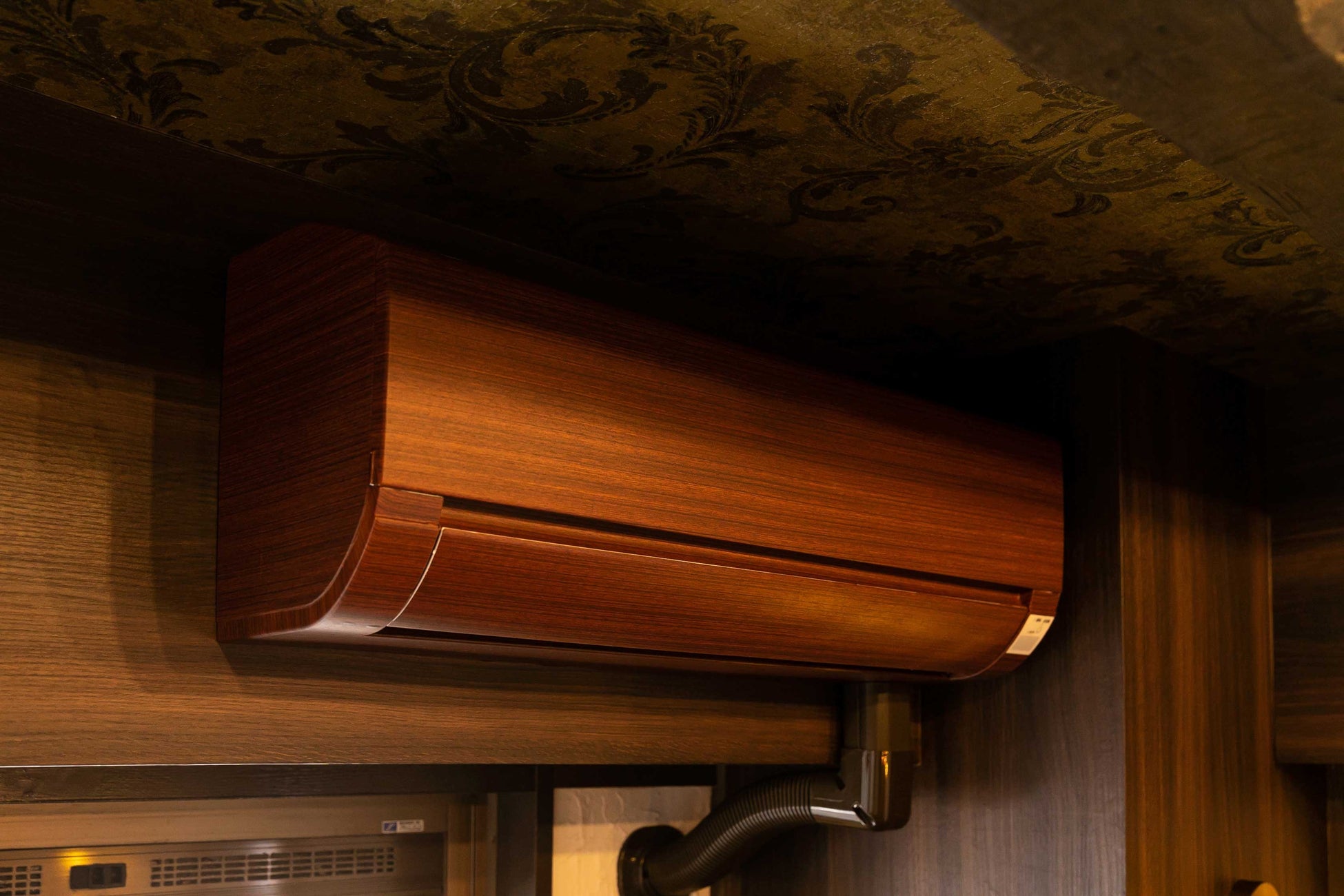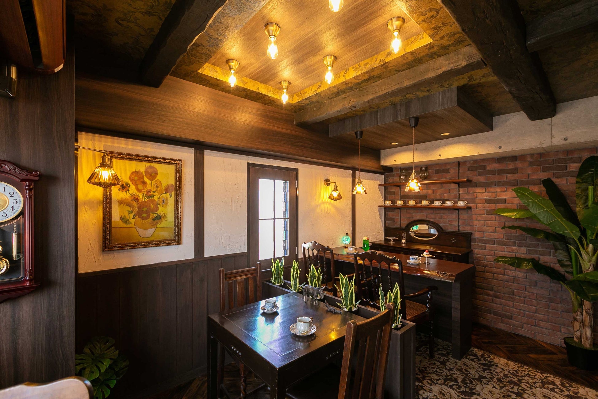 7.5帖の部屋を徹底的に純喫茶風にリノベーションしました。机や椅子も木製アンティーク調のアイテムで揃え、柔らかい光を放つ照明で演出。また、窓にはステンドグラス風フィルムを貼って住宅感を軽減しました。さらに備え付けのエアコンもイメージを崩さぬよう木目調のカッティングシートで覆い、温かみのある純喫茶の雰囲気に溶け込むようにするなど、自宅に居ながらもドアを開けると本当の純喫茶に来店したかのような、これまでの&room随一とも言える作り込みになっています。
