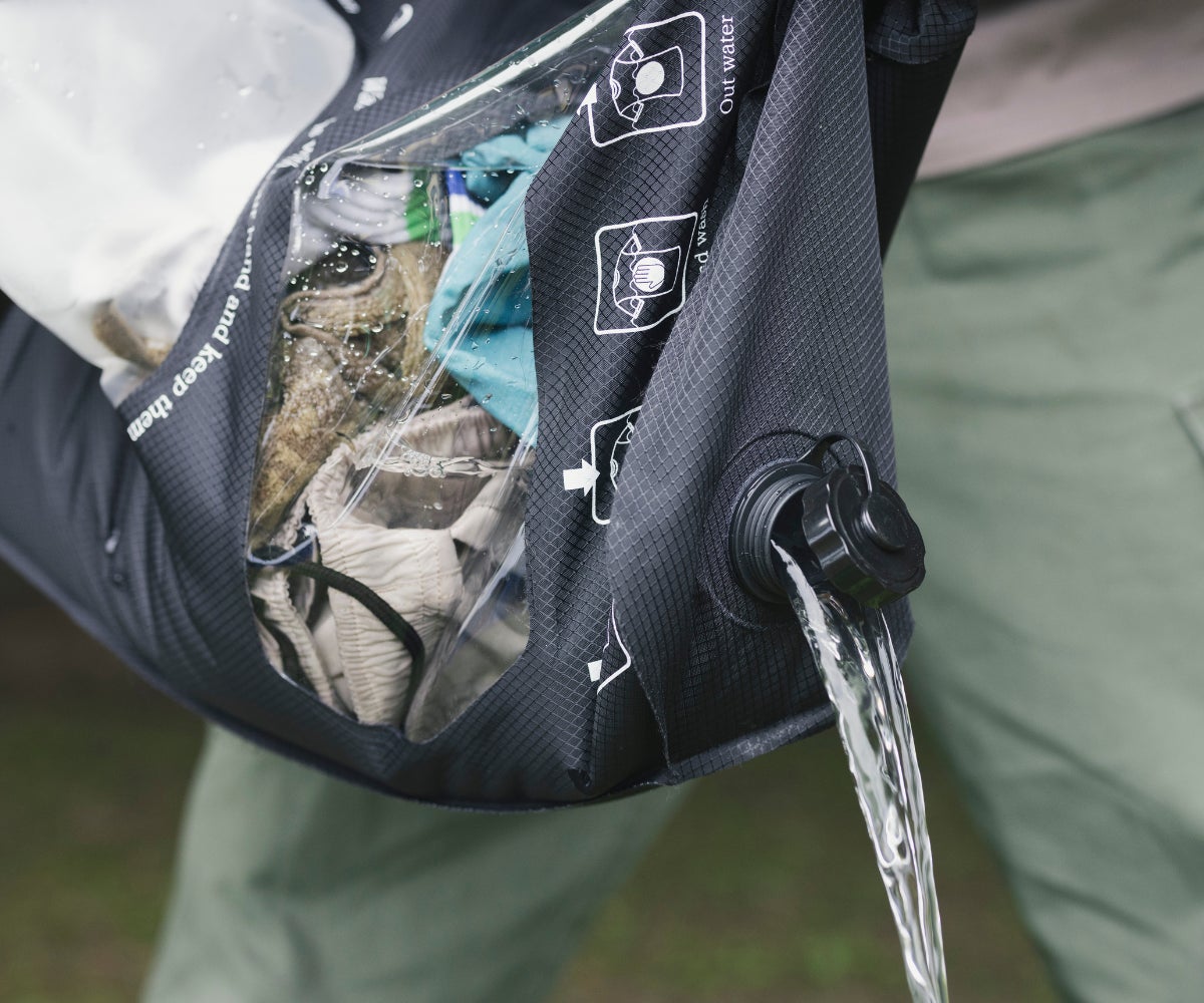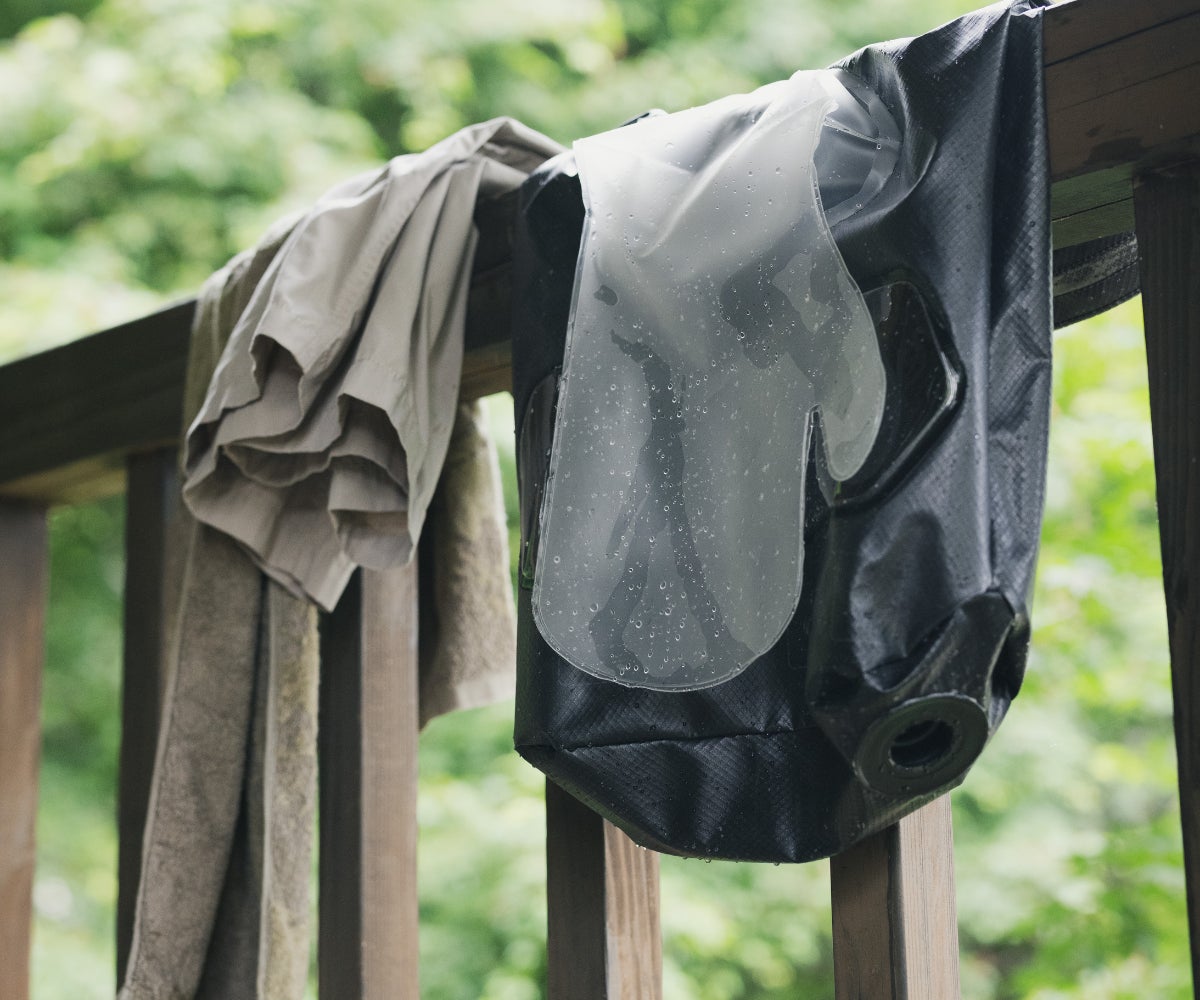 バッグ本体は表裏を簡単にひっくり返すことができます。タオルなどで拭くだけで本体内部についた水分を簡単に取り除くことができるほか、バックルを使うことでフックなどに引っ掛けて自然乾燥させることも可能です。