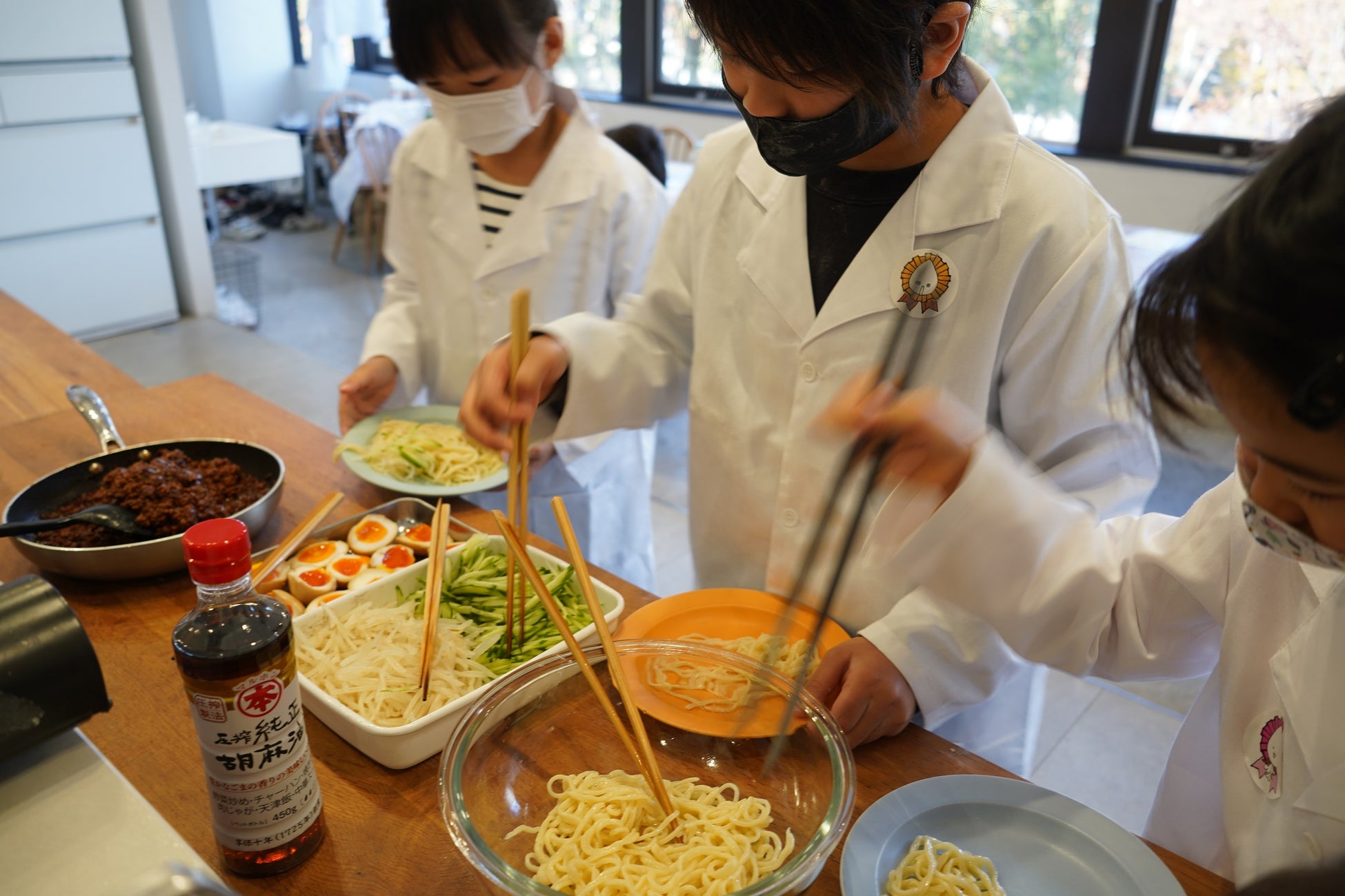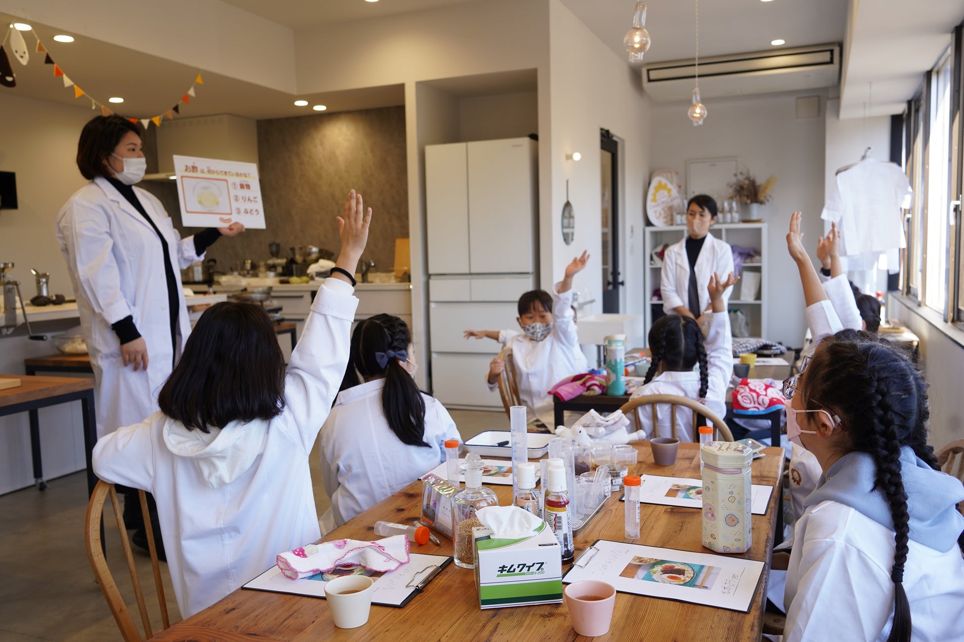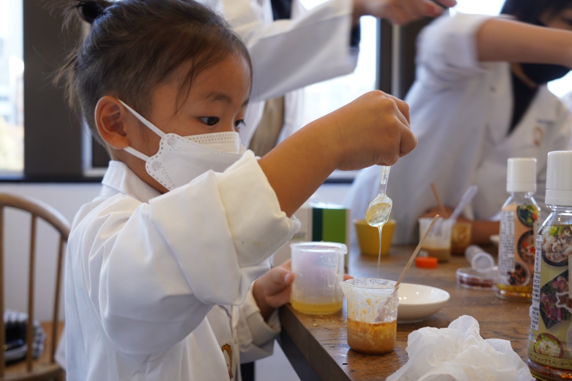 子どもたちが白衣をまとい「クッキングラボ」の研究員に!レシピを自分で考えるオリジナルあわせタレづくりや「ごま油しぼり」などに挑戦します。