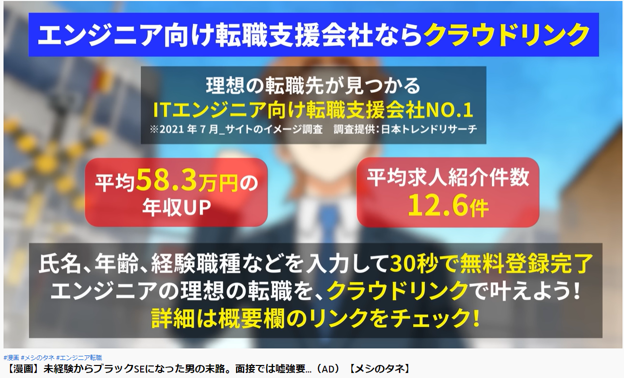 ブラック会社に勤めるSEが苦節を経て、クラウドリンクを利用し見事転職に成功するというストーリーを漫画動画として作成・公開頂きました。