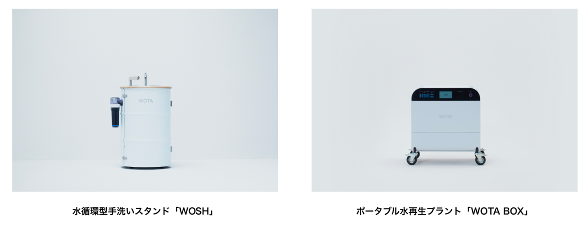 製品として、災害時等に仮設シャワー施設として活用できる可搬型の水再生処理プラント「WOTA BOX」、水道不要の水循環型手洗いスタンド「WOSH」などを展開しています。