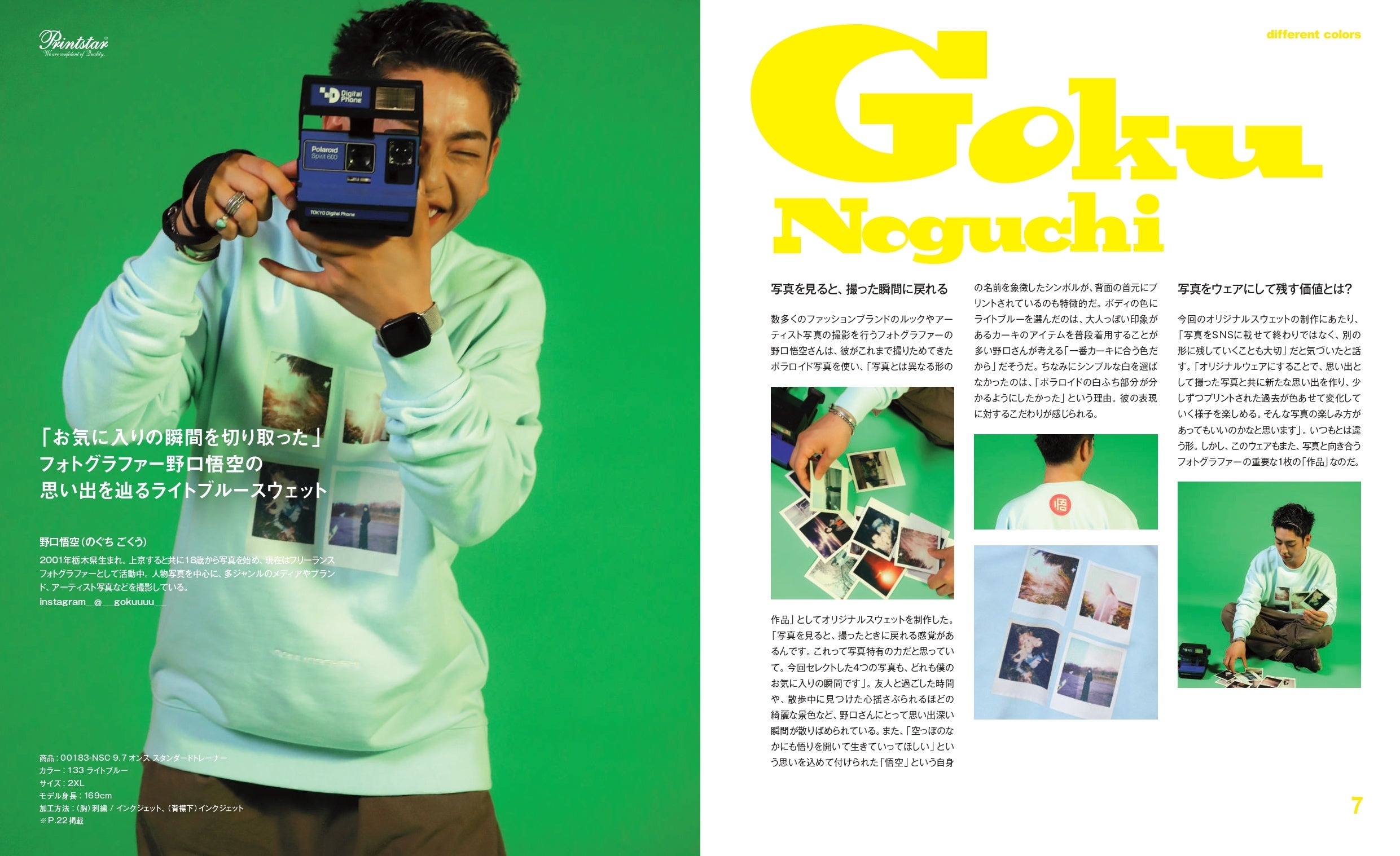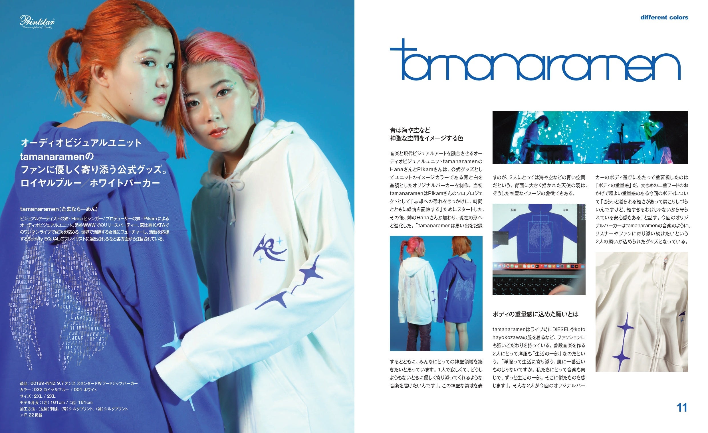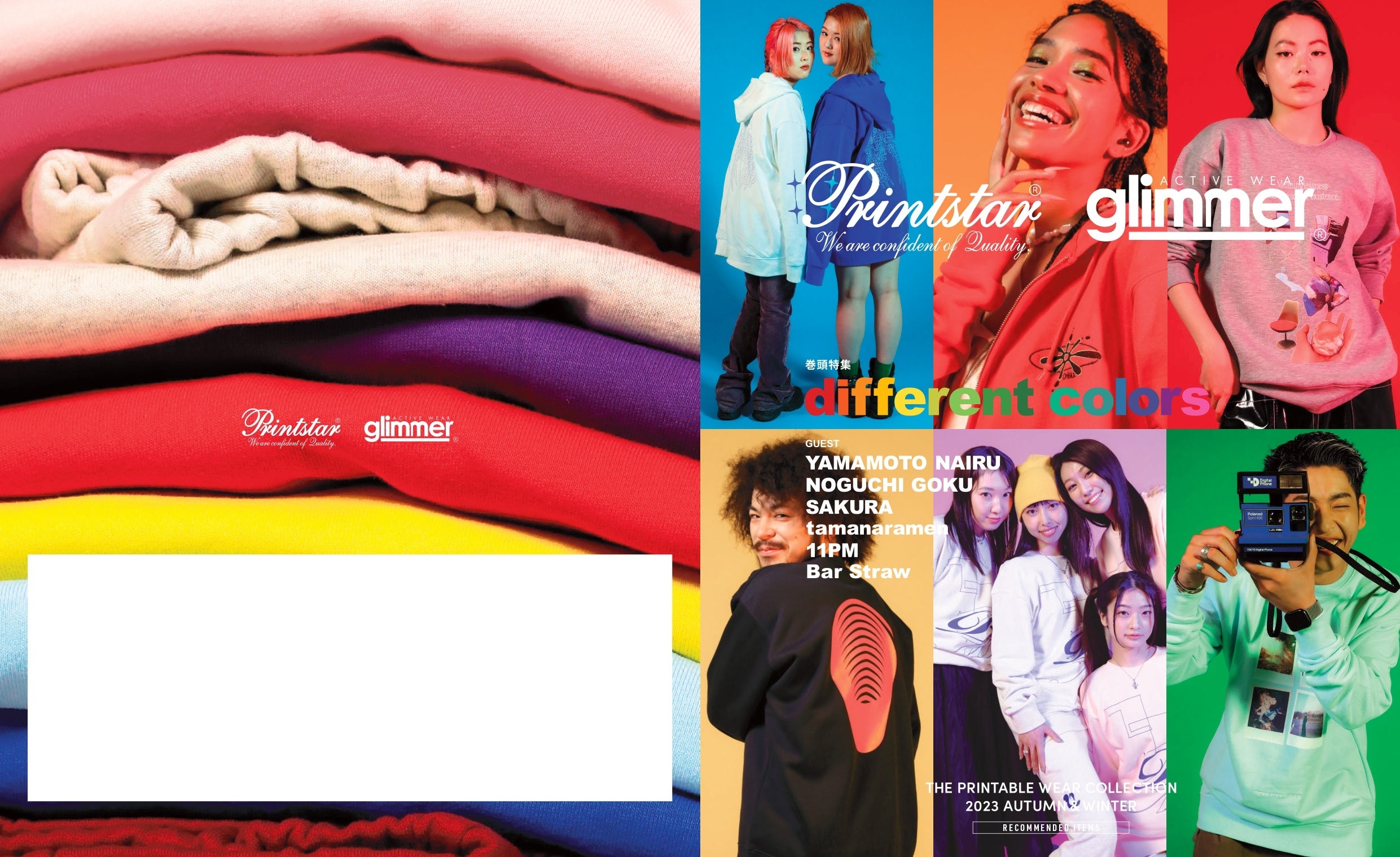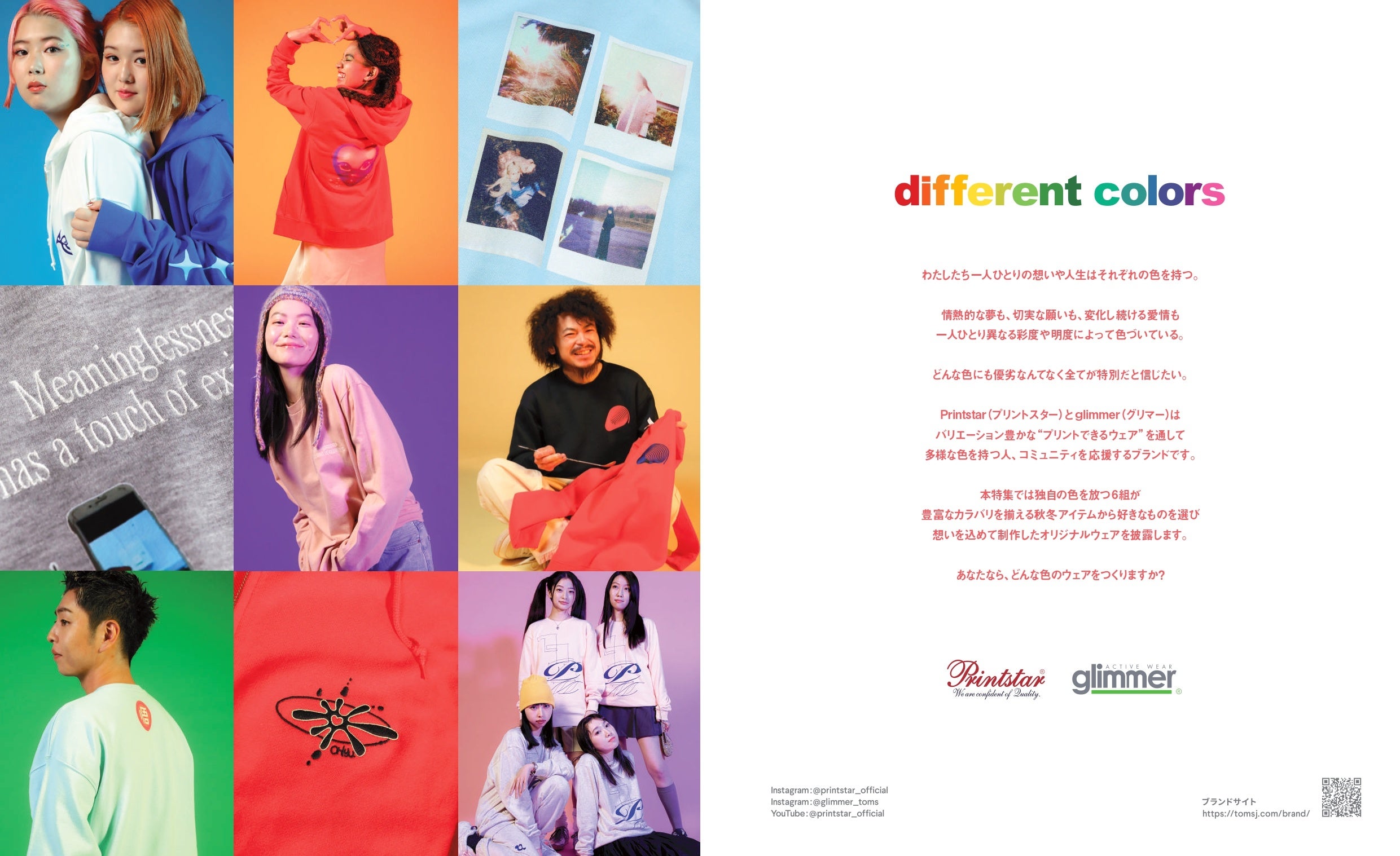 巻頭特集「different colors」では、独自の色を放つ6組の出演者たちが、豊富なカラーバリエーションをもつ「Printstar」と「glimmer」の秋冬アイテムの中から、好みの色とウェアを選び、想いを込めたオリジナルウェアを制作し、披露しています。