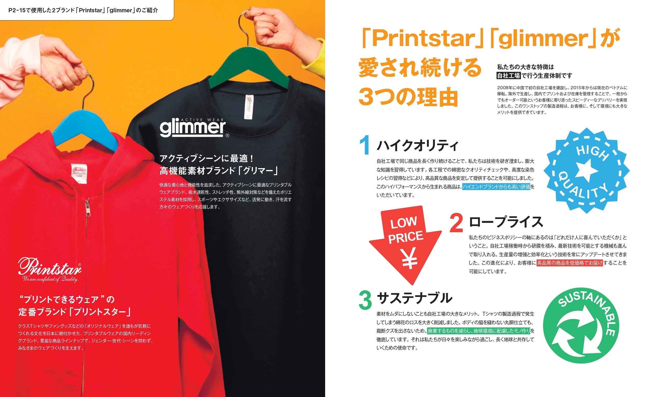 「Printstar」は老若男女問わず様々なシーンで着用いただける豊富な商品展開・カラーバリエーションが魅力。一方「glimmer」は、吸汗速乾やUVカットなど、機能性に優れた素材を採用しています。自社工場を所有することによる「ハイクオリティ・ロープライス・サステナブル」の三拍子を実現し、20年以上にわたり多くの方々に愛され続けています。