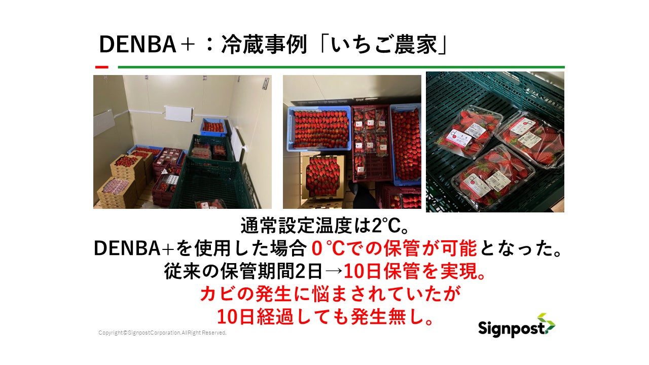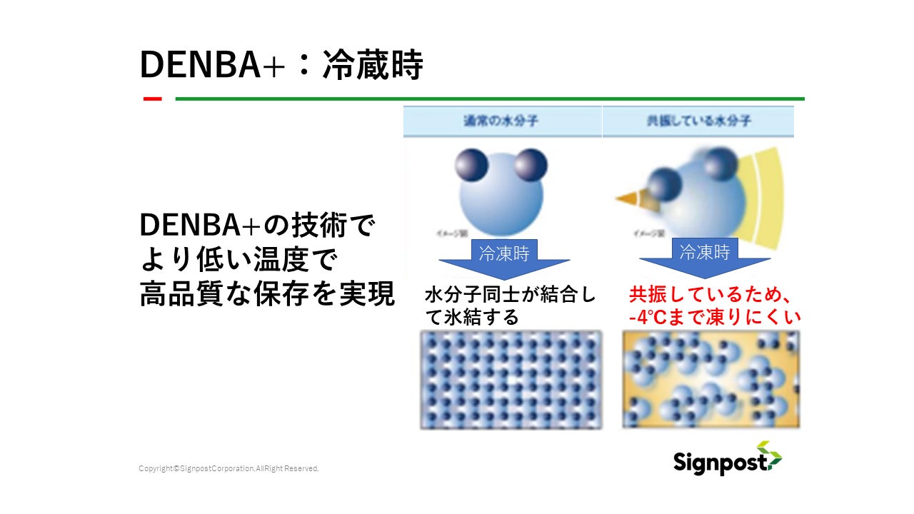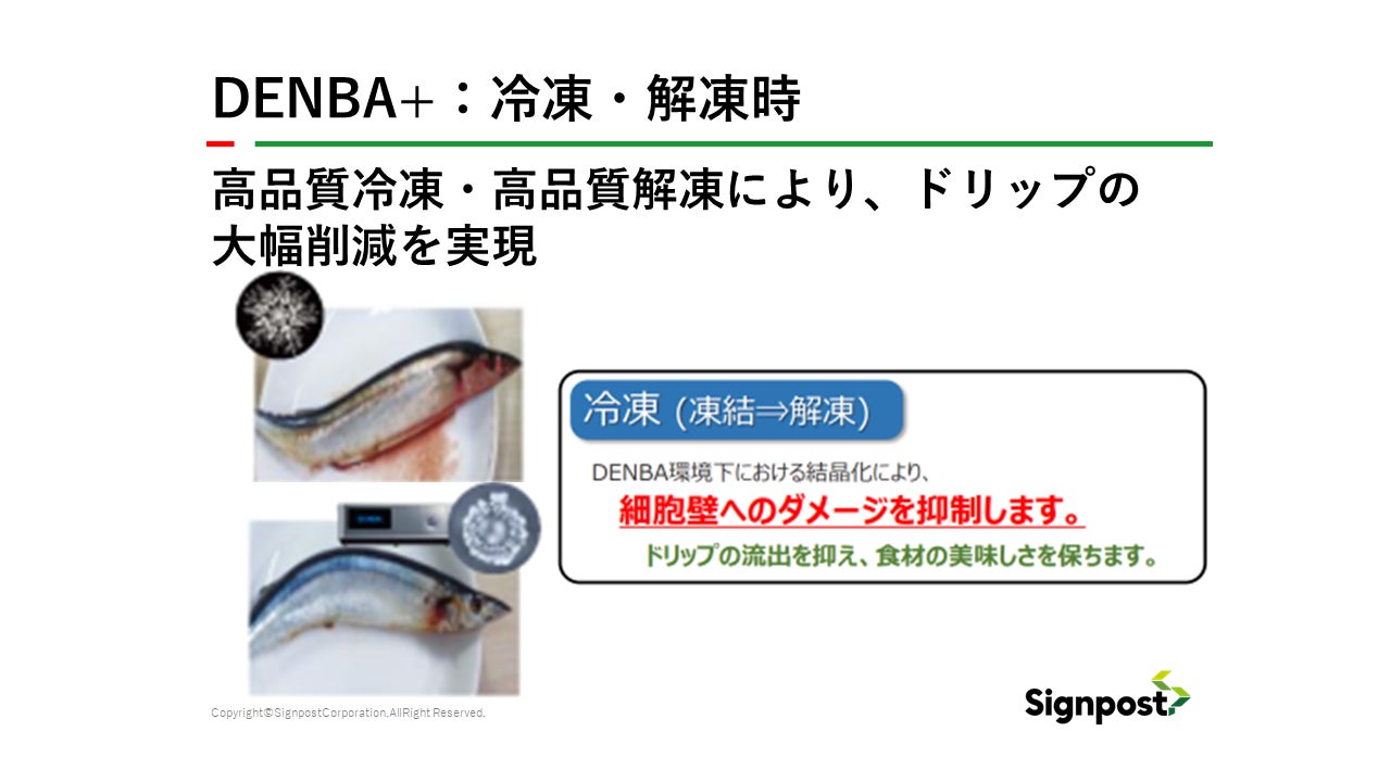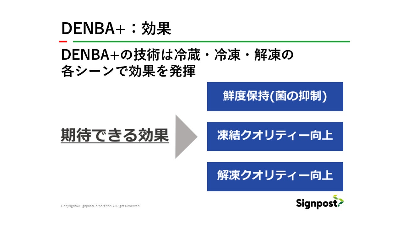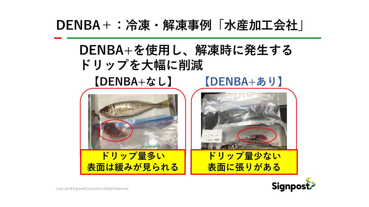 DENBA+とは、DENBA株式会社(東京都千代田区、代表取締役 後藤錦隆、以下「DENBA」)が開発した鮮度保持ソリューションです。独自技術により水分子を共振させることで、生鮮食料品の鮮度を長期間維持したりドリップ量を大幅に減少させ、「コスト削減」「付加価値の向上」および社会課題である「フードロスの削減」にも大きく貢献します。