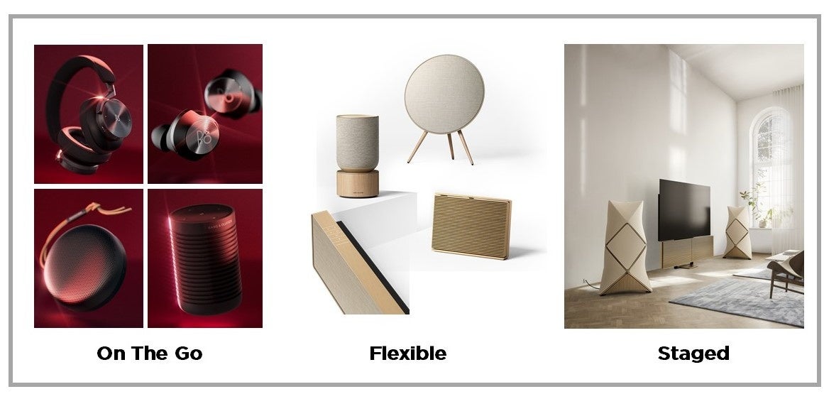 ご自宅でホームシアター体験ができるテレビやステレオスピーカーを展開する「Staged(ステージド)」カテゴリーの製品をはじめ、Wi-Fi接続でインテリア性も高く持ち運べるスピーカーカテゴリー「Flexible (フレキシブル) 」、そして屋内屋外問わず、様々なシーンで良質な音を堪能できるヘッドホンやイヤホン、ポータブルスピーカーを含む「On The Go (オン・ザ・ゴー)」カテゴリーといった、多岐にわたる製品ラインナップを取り揃えております。