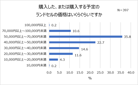 また、ランドセルの価格について尋ねると、「50,000円以上~70,000円未満(35.8%)」が最も多く、次いで「40,000円以上~50,000円未満(22.7%)」、「30,000円以上~40,000円未満(14.6%)」が続きました。6年間子どもが使うものだからこそ、一定の質を見越した比較的中堅価格のランドセルを選ぶ傾向があると言えそうです。