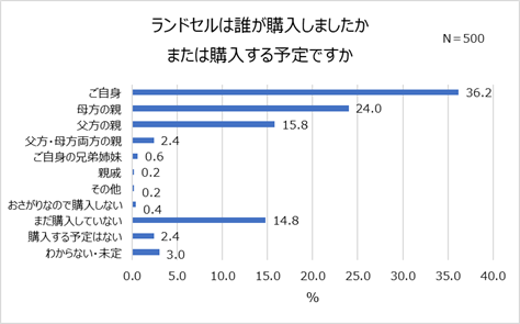 上記では、「既に用意していてお祝いの品とダブってしまった」という声もありましたが、入園・入学前は用意しなくてはいけないものが沢山あります。中でも、入学前に用意する代表的なものといえば、ランドセル。子どもの大切な小学校生活を支えてくれるランドセルは、誰が購入することが多いのでしょうか。調査すると、3割以上が、子どもの親である「ご自身(36.2%)」が購入、または購入予定であることが分かりました。一方で、「母方の親(24.0%)」が8.2pt差で「父方の親(15.8%)」よりも多く、子どもの祖父母では母方の親が購入する機会が多いことが明らかになりました。