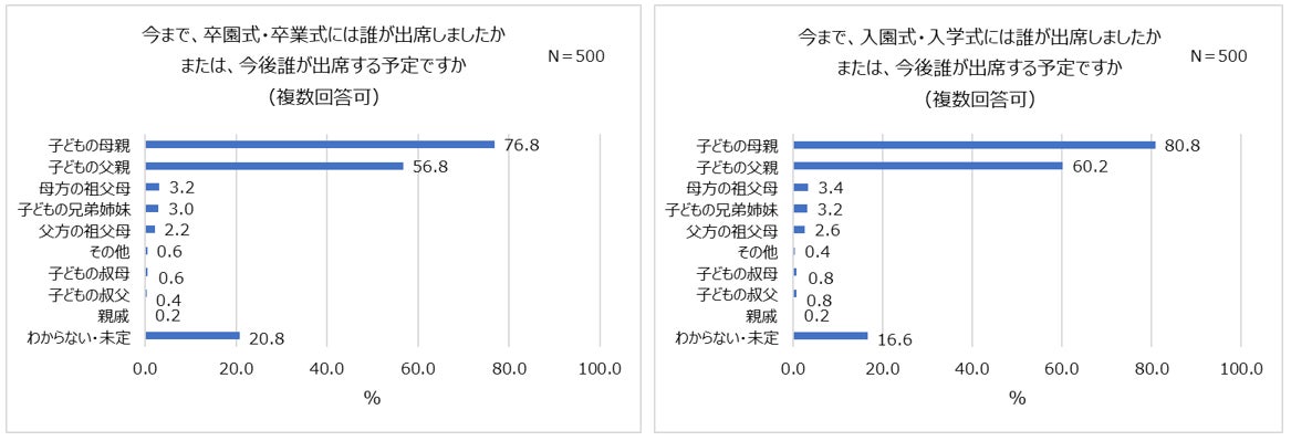 株式会社スタジオアリス(本社:大阪府大阪市、代表取締役社長:牧野 俊介)は、入園前~小学校1年生の子どもを持つ男女250名と、小学校6年生~中学校1年生の子どもを持つ男女250名の計500名を対象に「卒入園・卒入学に関する最新事情調査」を実施いたしましたので、その結果をご報告します。