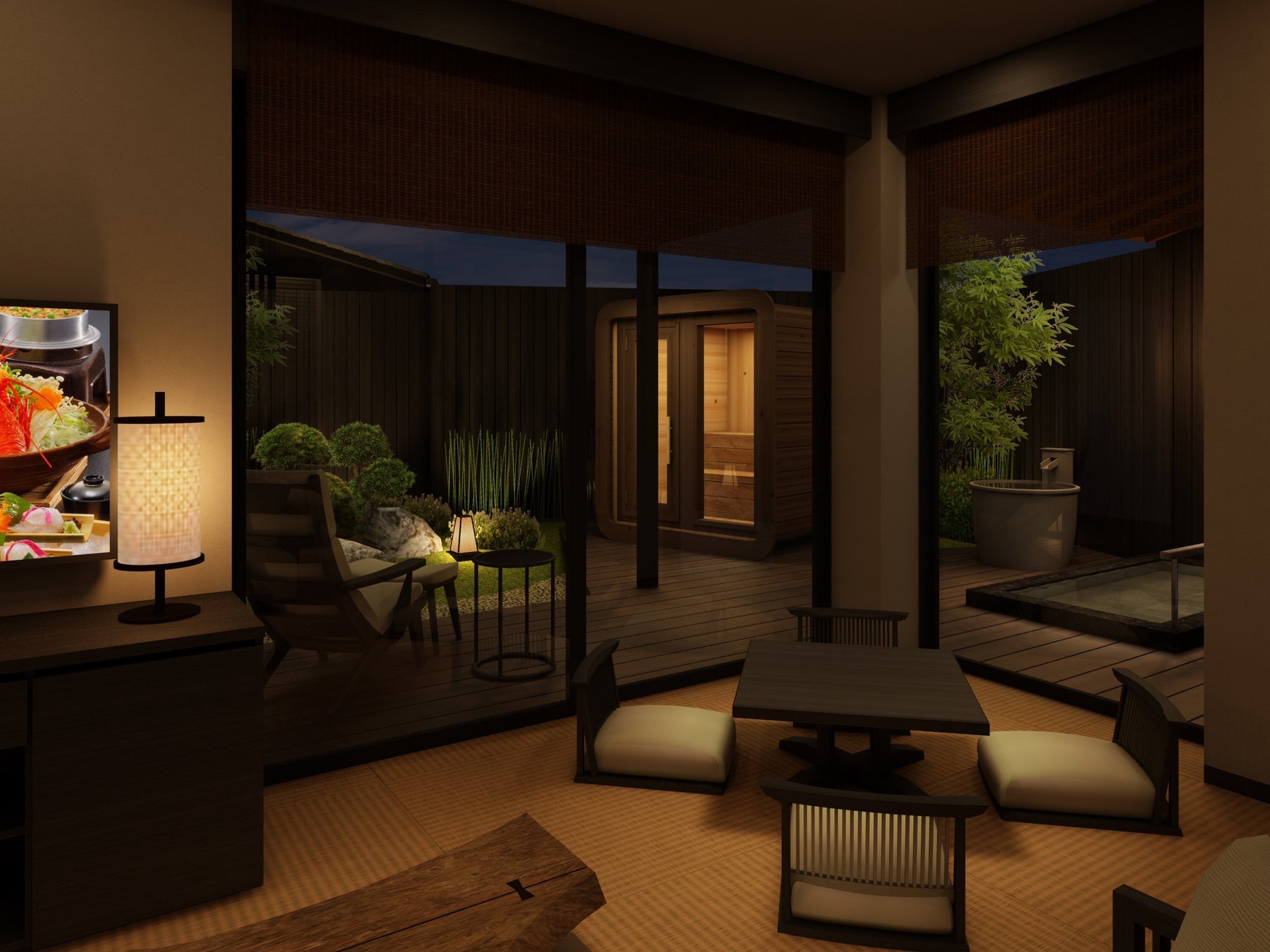 優雅な庭園を配した、温泉露天風呂・サウナ・水風呂を完備したラグジュアリーなお部屋です。