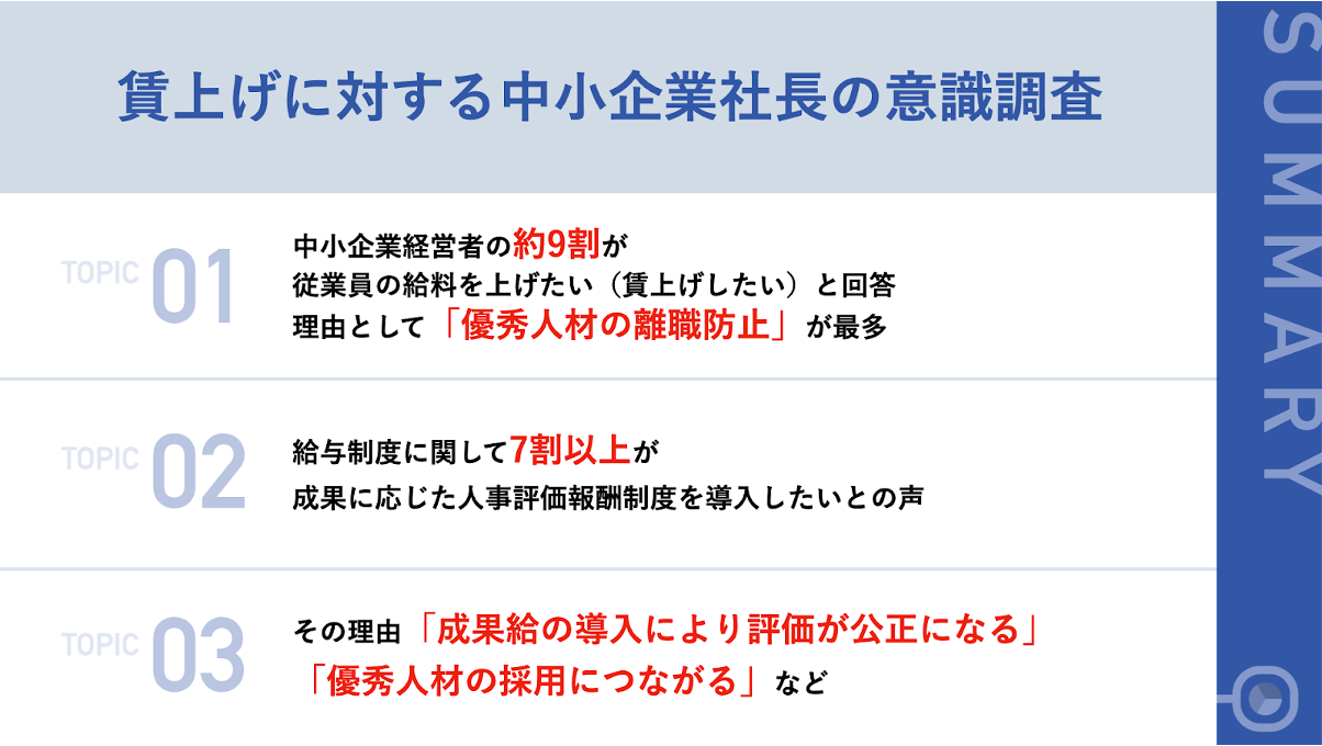 今回の調査では、中小企業の社長が、従業員の賃上げの必要性を実感しているものの、充分な利益が出ていないことや、公正な評価基準がないことにより、賃上げに課題を抱えている実態が明らかとなりました。これからの時代、優秀人材を確保するためには、長らく続いた年功序列の評価基準から脱却し、従業員の成果を公正に評価する必要があります。そのためにも、成果に応じた人事評価報酬制度を取り入れてみてはいかがでしょうか。