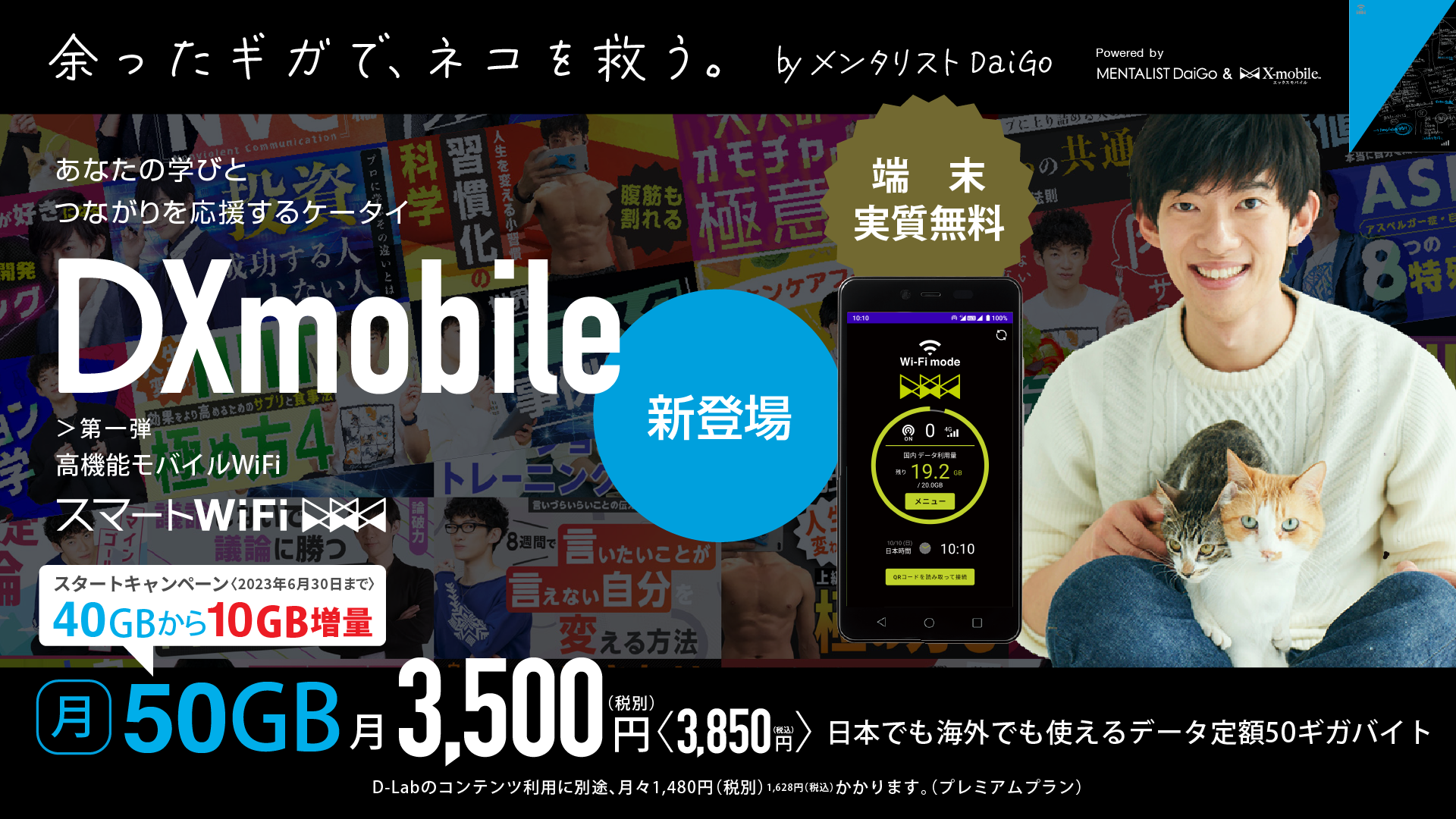 エックスモバイルは、MVNO(Mobile Virtual Network Operator)として、自社で通信インフラを持たずに大手キャリアの通信インフラを利用して、データ通信を低価格で提供するサービスを展開しています。また、全国に170箇所ある店舗では、乗り換えの手続きや修理等の各種サービスが受けられます。さらに、MVNOに付加価値をつけたサービスも展開しており、メンタリストDaiGo氏と共同企画した「余ったギガで、ネコを救う。」”DXmobile”や、堀江貴文氏と提携した「参加できる、応援できる、未来に加速するLCCモバイル」”HORIE MOBILE”等があります。
