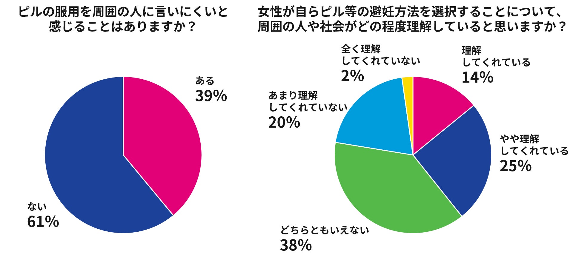 一方、「ピルの服用を周囲の人に言いにくいと感じることはありますか?」という質問には39%の人が「ある」と回答し、「女性が自らピル等の避妊方法を選択することについて、周囲の人や社会がどの程度理解していると思いますか?」という質問に対しては、「理解してくれている」、「やや理解してくれている」と回答した人が39%に留まりました。
