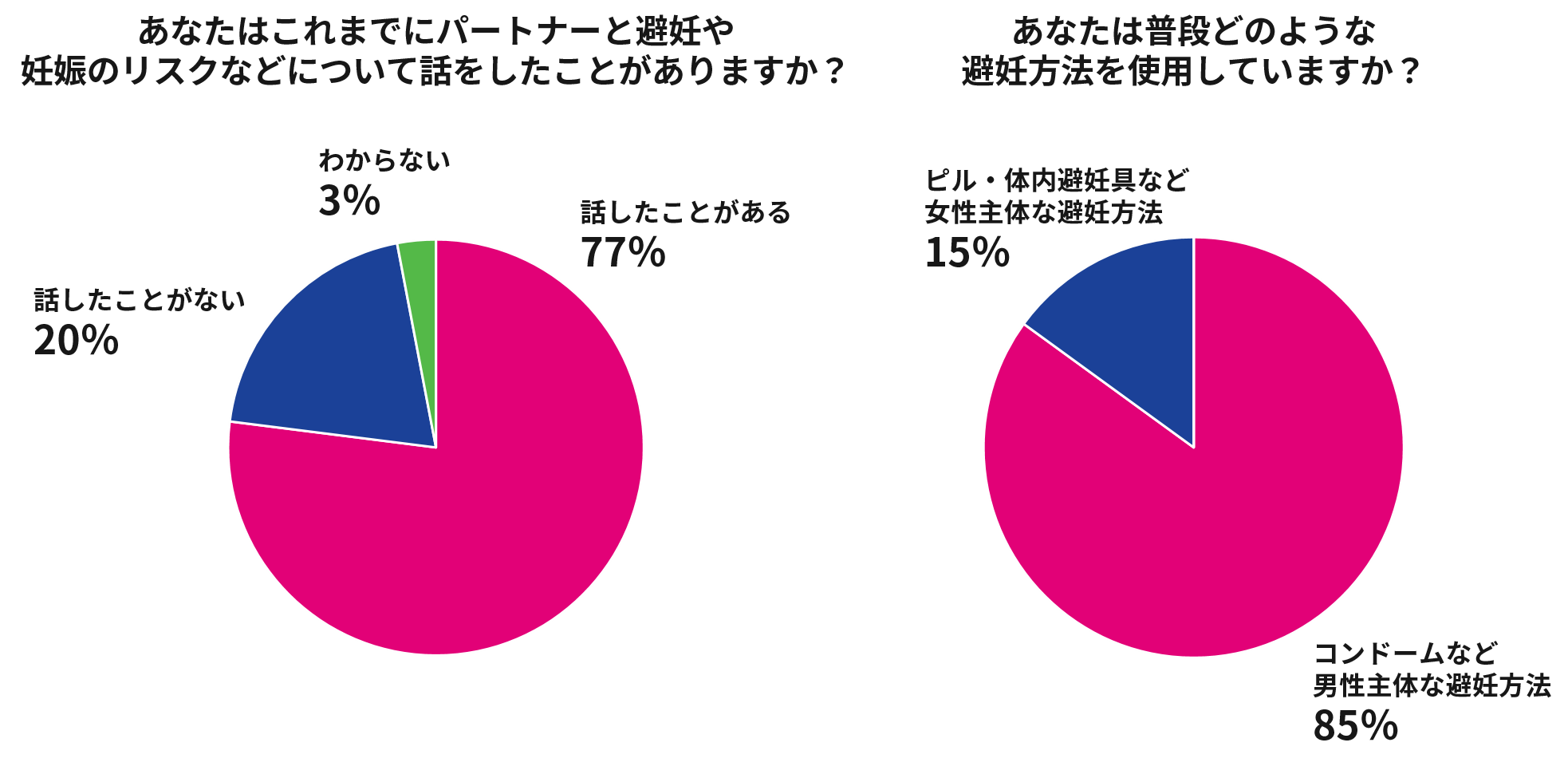 一方で、「あなたは普段どのような避妊方法を使用していますか?」という質問に対しては、85%の人がコンドームや体外射精などの男性主体の避妊方法を選択しており、避妊方法の選択に偏りがあることがわかりました。