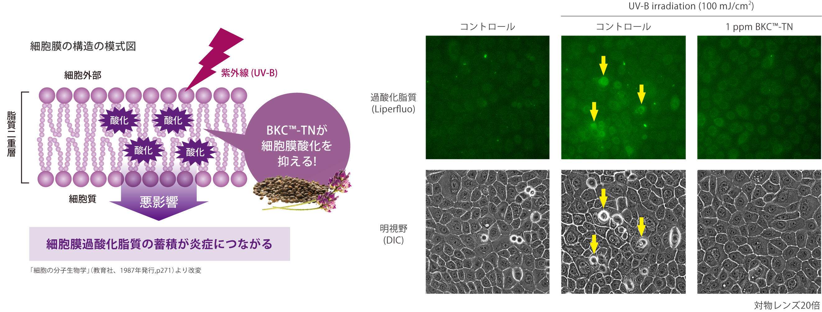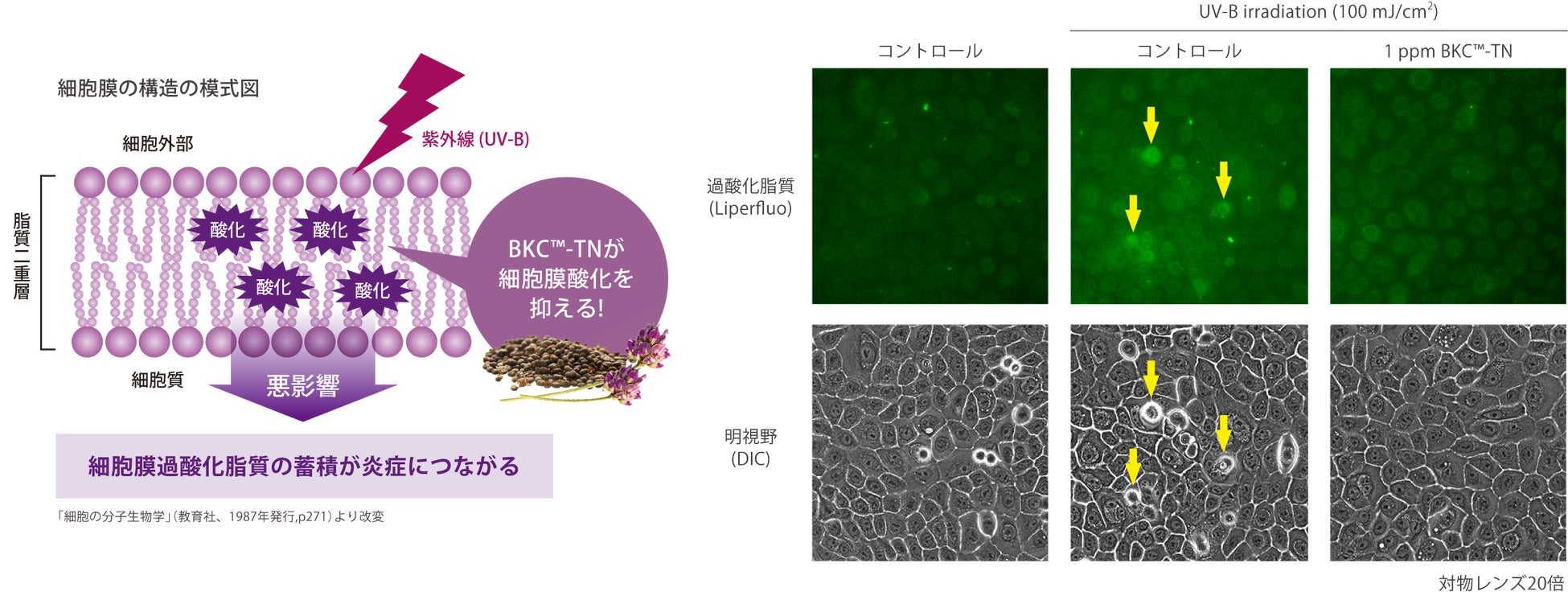 つまり、BKC™-TNは、ビタミンAで知られるブライトニングや抗シワ効果に加えて、独自に見出した細胞膜保護作用によって、炎症や乾燥などにも有効な、非常に幅広い用途の機能性成分であることがわかりました。
