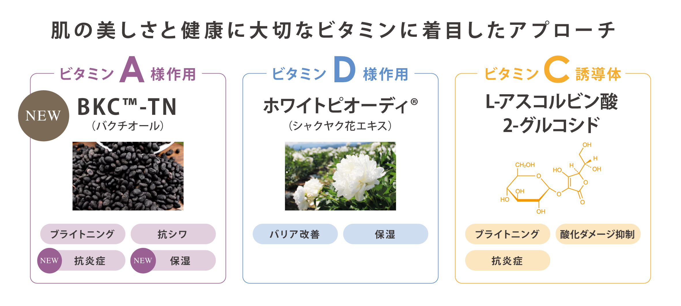 一方、テクノーブルではBKC™-TNの他にも、肌のバリア機能形成の中心を担う「バリアビタミン」ともいうべきビタミンDと同様の働きを示す「シャクヤク花エキス(製品名:ホワイトピオーディ®)」や、ブライトニングにおいて多様な働きをもつL-アスコルビン酸 2−グルコシド(ビタミンC誘導体)など、肌に大切なビタミンに着目したスキンケアアプローチを叶える製品を揃えています。