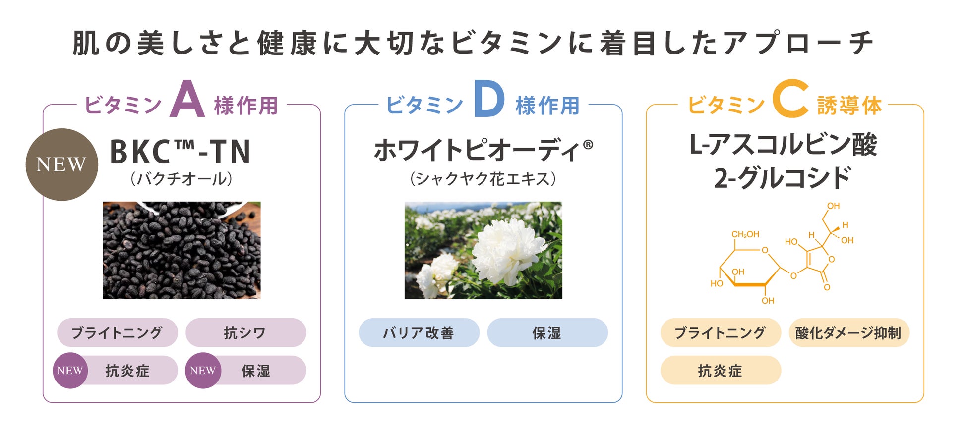 バクチオールだけでなく、ビタミンC、ビタミンDなど、肌に必要なビタミン類に着目したスキンケアアプローチを美容成分の観点から、総合的にご提案いたします。