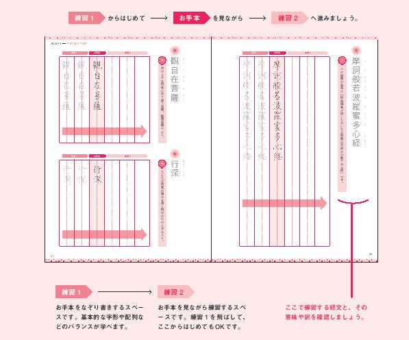 誌面のお手本をあえて中央に配したり、短い語句から練習をはじめ、1行、3行、全文と徐々に書くことに慣れていく構成になっています。難しいと思われがちな般若心経の意味や訳もやさしく解説。理解を深めながら練習ができます。また、カバーの裏にはお寺に納める「納経」ができる書式のお手本を用意。初心者から上級者まで誰もが効率よく学ぶことができます。