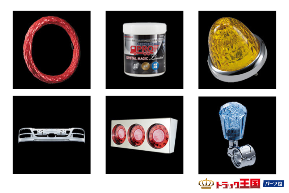 取り扱いパーツ一例:トラックメッキパーツ・トラック電装品・トラック内装品・洗車用品