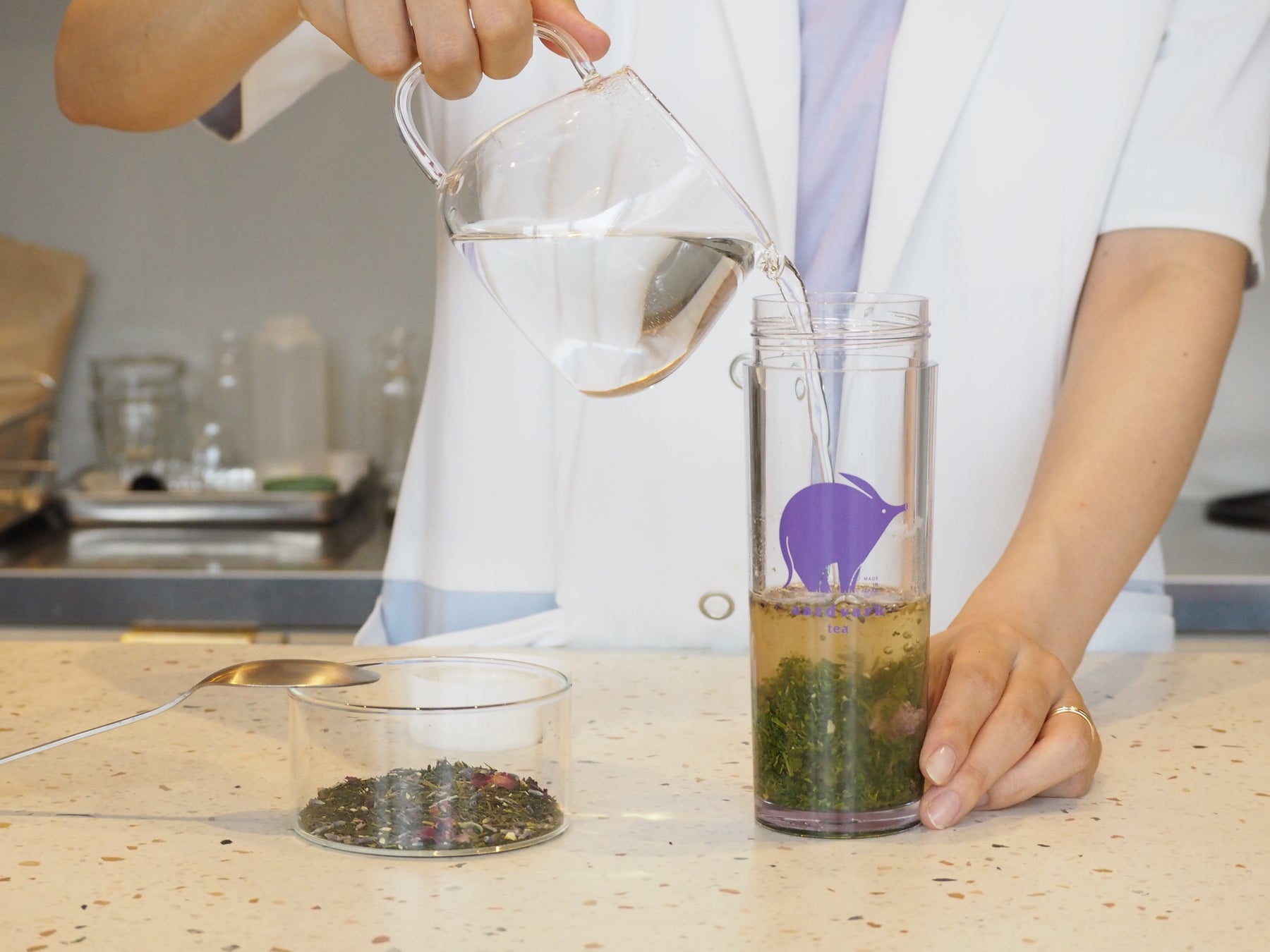 専用のボトルは、フィルターインボトルとなっていて、茶葉を直接入れ、お湯や水を注いだ状態でお渡しします。飲み進めていくうちに水量が減ったら、お湯や水を継ぎ足し、2〜3煎まで楽しんでいただけます。急須いらずで、オフィスや学校など広く家の外でも茶葉から淹れた本格的なお茶を、自由に、手軽に楽しむことができます。