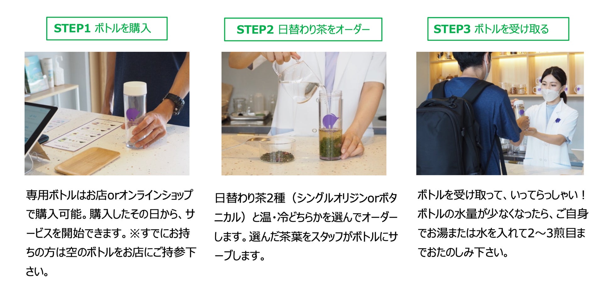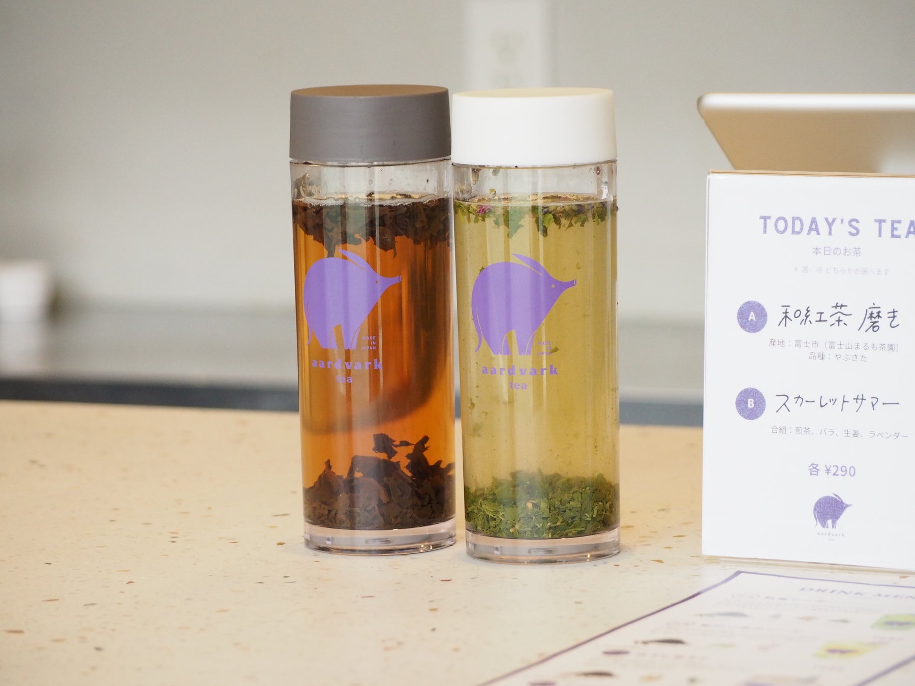 提供する茶は、日替わりで用意。こだわりの“シングルオリジンティー”とaardvark teaならではの”ボタニカルティー”の2種類で、それぞれ温冷を選ぶことができます。” シングルオリジンティー” は、農家さんから直接仕入れている静岡県産の単一産地・品種茶葉を提供。 シングルオリジンならではの個性ある味わいを楽しめます。” ボタニカルティー” は、aardvark teaの得意とする茶と自然素材、ハーブやスパイスなどのブレンド。月曜日は、気分をあげる素材や味わい、金曜日はチル、といった曜日のリズムにあわせた処方でフレーバーを展開していきます。1杯あたりにするとペットボトル茶と比べても経済的なプライスで、ボトルは洗って繰り返し使用できるため、プラスチックゴミの削減にも繋がり、サステナブルなライフスタイルとしても、aardvark teaメンバーを提案していきます。