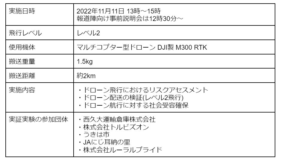 今回の実証実験は、10月21日に西久大運輸倉庫、トルビズオン、うきは市の三者で締結した「ドローンを活用した持続可能な地域づくりに関する連携協定」の第一弾であり、地域におけるドローン飛行のための合意形成がどのように進めていくべきか、うきは市との官民連携で地域活性化とドローンを用いた新産業の活用を実現することを目的としております。